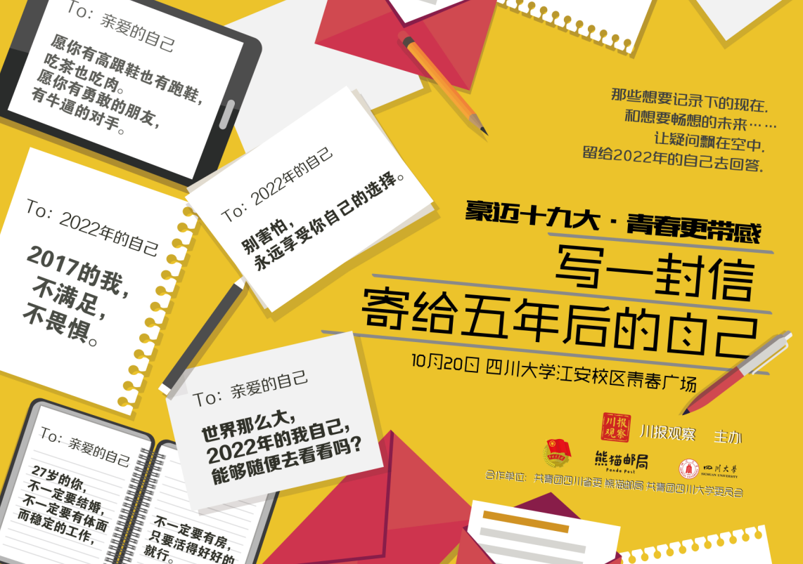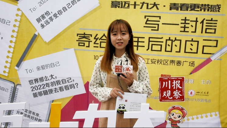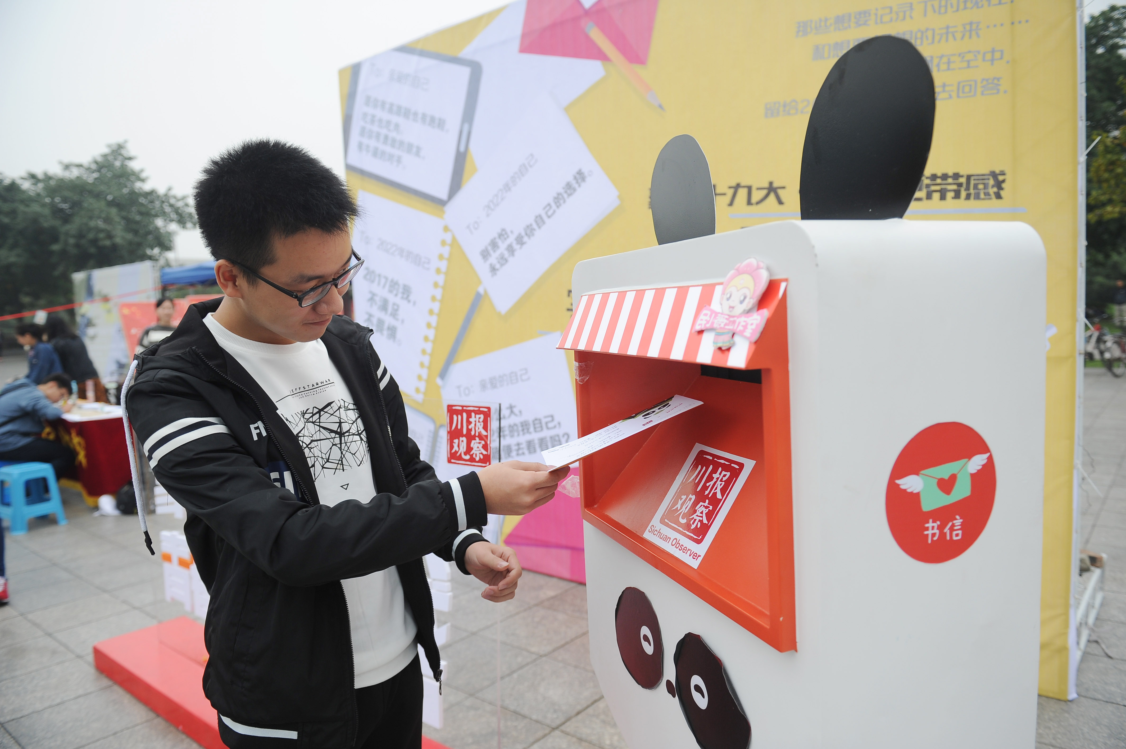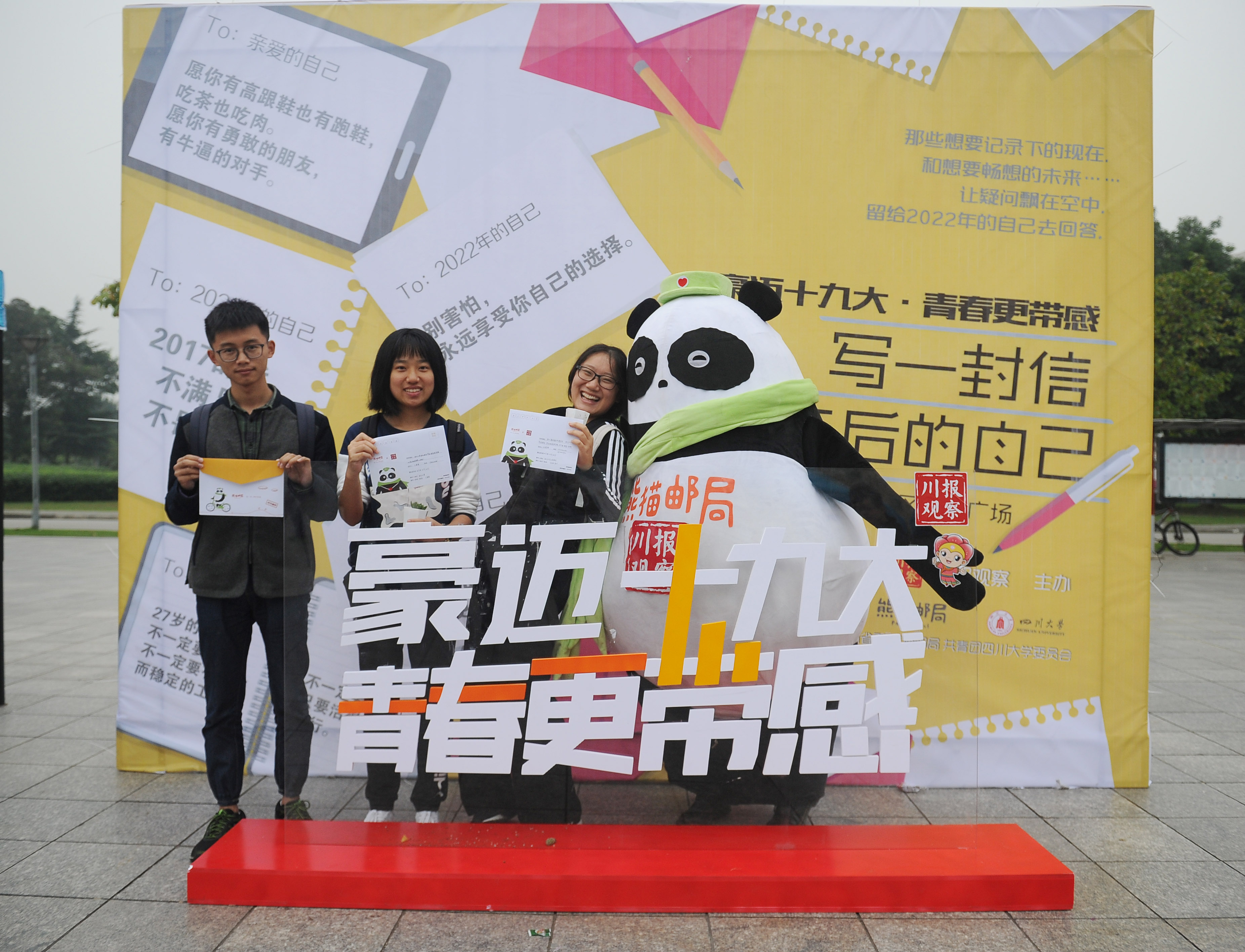 10月20日,川报观察联手共青团四川省委、熊猫邮局,走进四川各大高校和城市地标的的“豪迈十九大·青春更带感——给五年后的自己写封信”活动来到了第二站——四川大学!