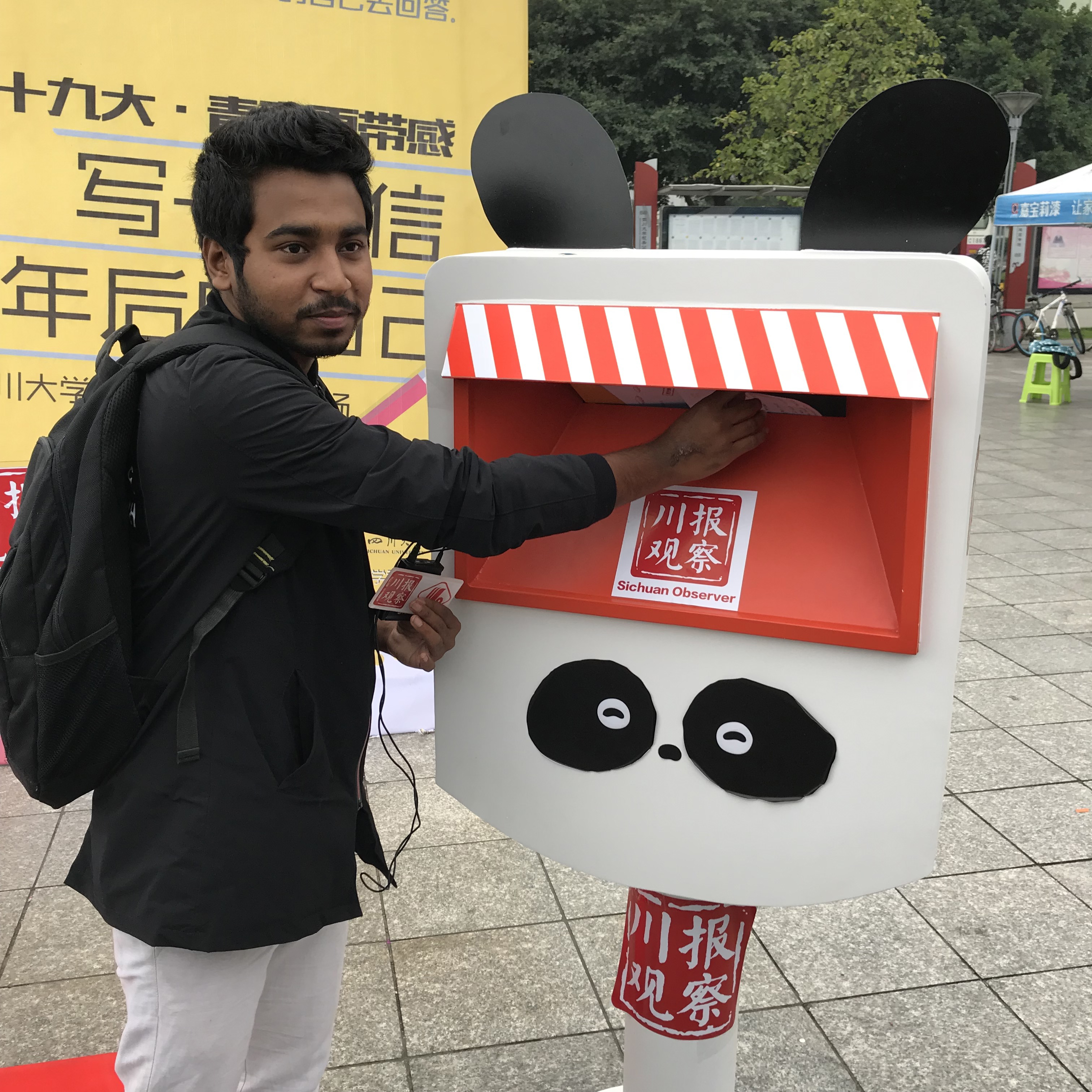 来自孟加拉国拉杰沙希市(Rajshahi)的Taring Aziz是四川大学软件学院的学生,今天是他来到中国的第22天,新同学们都非常友好,让他感到快乐,他希望自己能学到知识,五年后进入微软公司。能来中国、来川大学习,令他深感荣幸,并对着川观君表白道:I love China!
