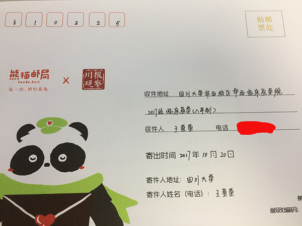 王莹莹同学是川大华西临床医学院八年制学生,当其他同学还在思考五年后自己在哪里的时候,她已轻松填好地址,等待五年后再与自己相见。