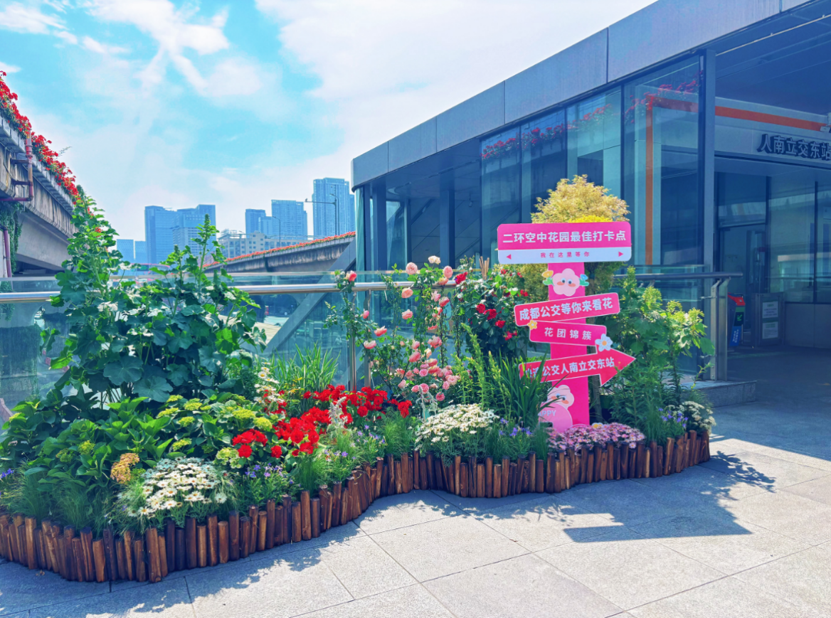 成都公交还在二环空中花园最佳打卡点位快速公交人南立交东站布置了实体花景,通过层次丰富的植物造景,为市民打造了一片绚丽多彩的诗意天地。