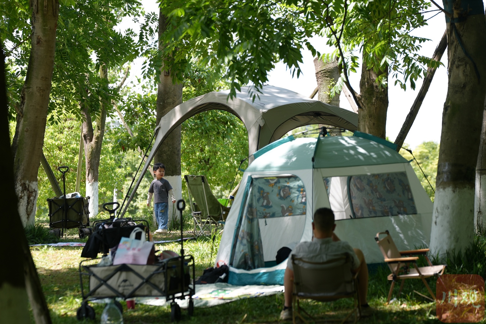 市民带着露营装备走进公园,准备开始一天的惬意时光。