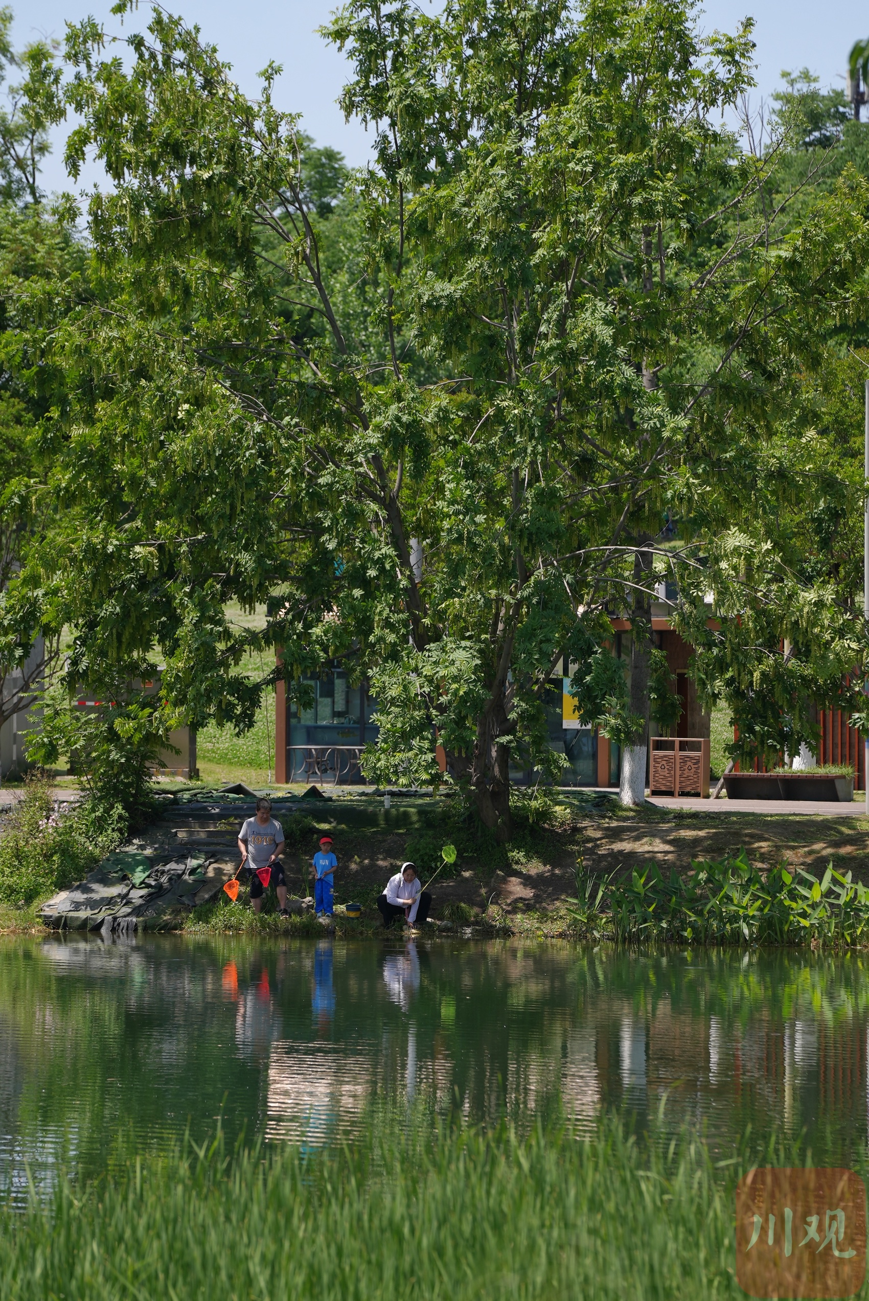 步入园区,树荫下错落分布着露营帐篷与彩色野餐垫,亲友围坐聊天、品尝美食,孩童在草地上追逐嬉戏。环湖绿道上,家长带着孩子骑行穿梭,构成流动的夏日画卷。池塘边,孩子们在家长陪同下手持渔网专注捞鱼,溅起的水花引发阵阵欢闹,亲子家庭的笑声此起彼伏。