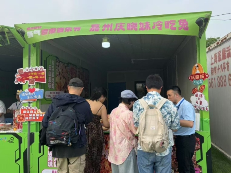 活动现场,乐山美食独特的麻辣香气引得年轻乐迷们驻足。“‘人肉’背来的产品全卖完了,不少食客现场添加企业微信。”庆晓妹冷吃兔负责人刘涛穿梭在人群中,忙得不亦乐乎。同样火爆的还有乐山传统小吃绵绵冰,晶莹剔透的冰沙淋上果酱,在初夏的燥热中为乐迷送去清凉。