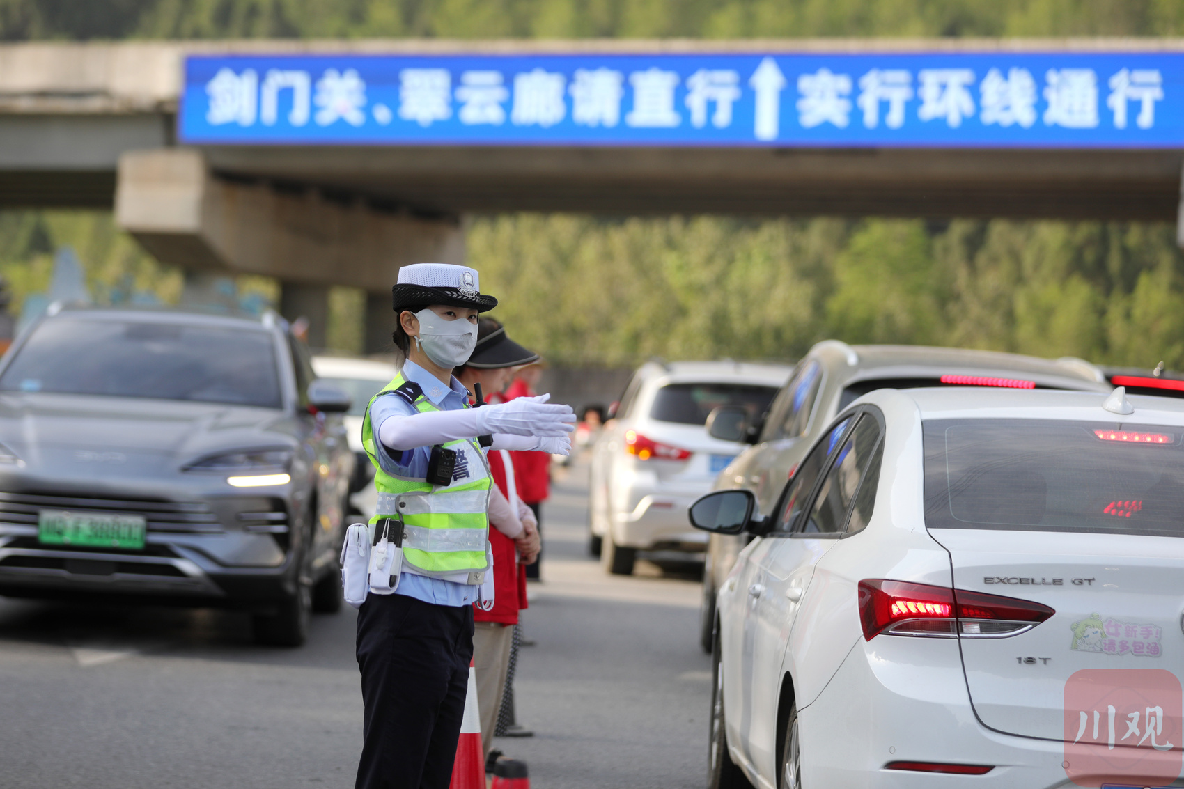 5月1日至4日,每天经过的旅游车辆数量达到上万辆,剑阁县交警部门全员上岗,还从剑阁县公安局机关、特警中队抽调警力支援,按照保畅预案,在车辆通行高峰时间段实行大、小环线单向绕行。