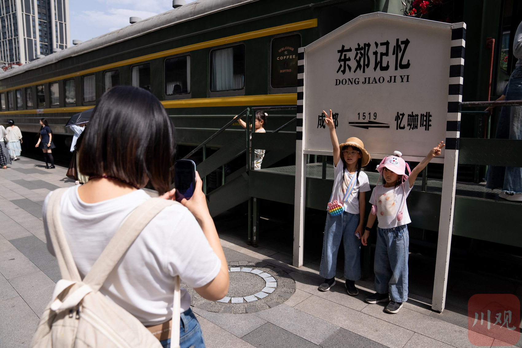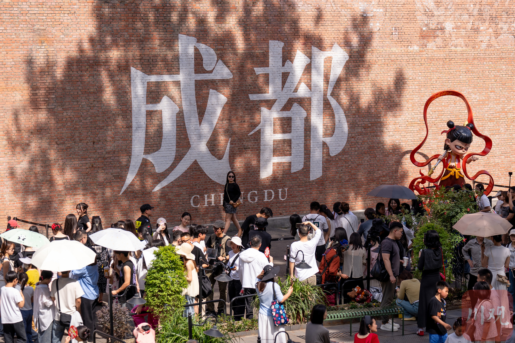 游客在成都东郊记忆“成都”地标墙拍照打卡。