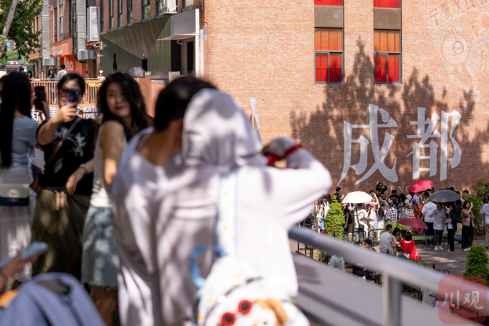 5月5日下午,作为成都热门打卡地,东郊记忆游人如织,这座由旧工业遗址改造而成的文创园区内,涌动的人潮与斑驳的红砖厂房形成奇妙共振。尤其是“成都”地标墙,更是现象级打卡点,吸引了许多游客前来驻足打卡。