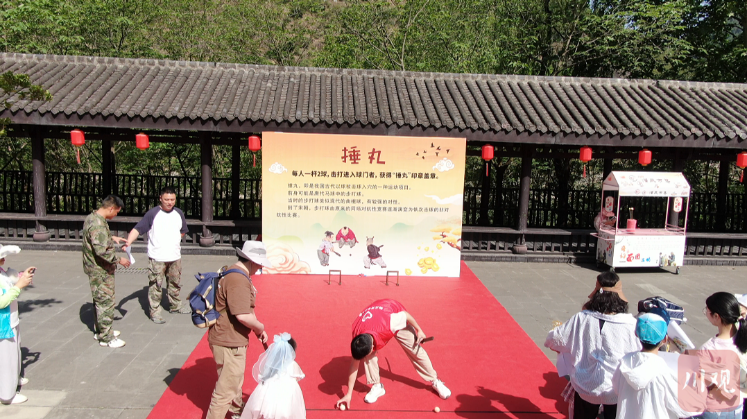 明月峡景区以“汉风集市穿越游”为主题,让游客沉浸式体验古韵风情。蜀风广场的汉风市集上,核桃饼、糖画等非遗美食散发着诱人香气,捏面人、剪纸等非遗手作摊位前也围满了好奇的游客。刘备、诸葛亮等三国人物扮演者穿梭其中,随时准备与游客互动拍照。从蜀风广场到演武场再到陈列馆沿线,设置了6个国风通关打卡体验区,投壶、木射等传统游戏让游客在游玩中领略古代雅戏的独特魅力,完成打卡任务还能抽取雪溪洞、水磨沟景区门票或文创礼品券。景区入口和明月酒肆处的唐风汉服换装区也深受游客喜爱,许多游客换上传统服饰,沿着古栈道漫步,感受历史与现实的奇妙碰撞。