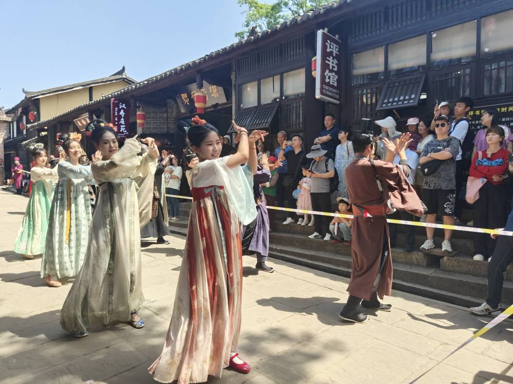 素有“巴蜀第一县,蜀国第二都”之称的国家4A级旅游景区昭化古城,在“五一”期间成为了游客打卡的热门之地。当地以蜀道文化、三国文化等多种文化元素为核心,在县衙街上推出了国风快闪活动,伴随着网络热门音乐响起,“刘备”“鲍三娘”“马超”等化身三国英雄的表演者,时而演绎动感舞姿、时而与游客热情互动,让广大游客在传统和现代的交织中感受到了传统文化的独特魅力。