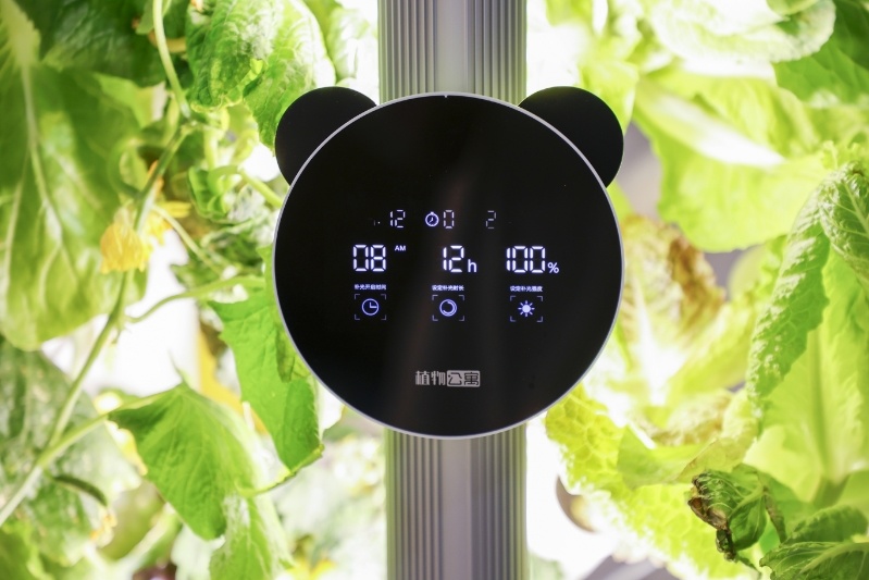 骆丹指着种植区旁有一根带有控制面板的灯管说:“这是灯柱区,配备了全光谱的LED植物生长灯。可通过熊猫控制面板设置光照时间、长度及强弱,自动模拟太阳光谱,确保植物在无自然光照的情况下也有充沛的光照。”