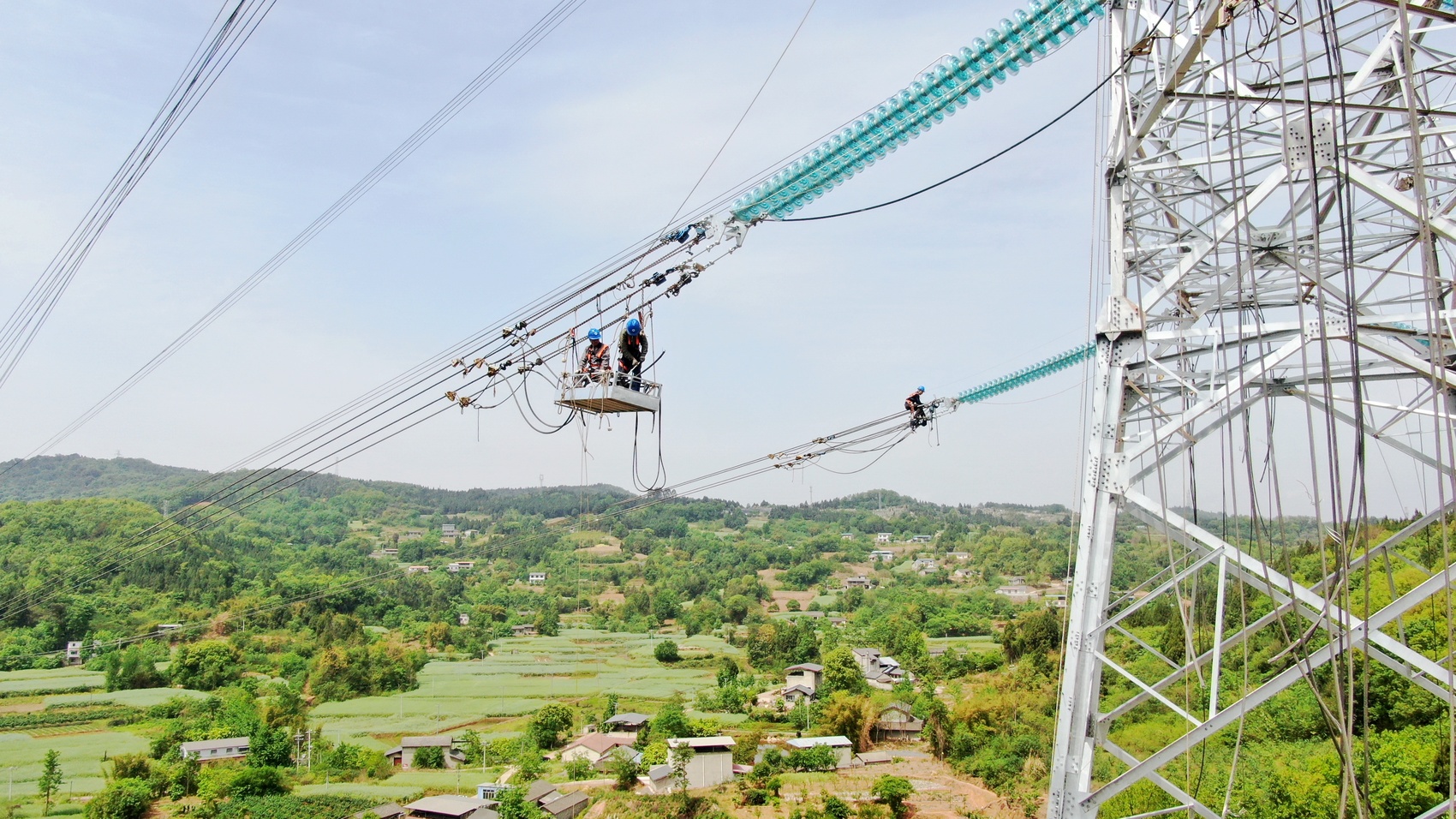 近日,在德阳市罗江区万安镇,国网德阳供电公司组织电网建设人员在谭家湾—什邡、谭家湾—富乐500千伏线路搭接工程1号塔开展紧线施工及附件安装工作。 陈前宇 摄