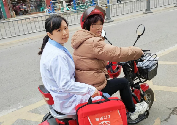 创伤骨科护士谭婷婷搭乘电动车前往患者家中换药