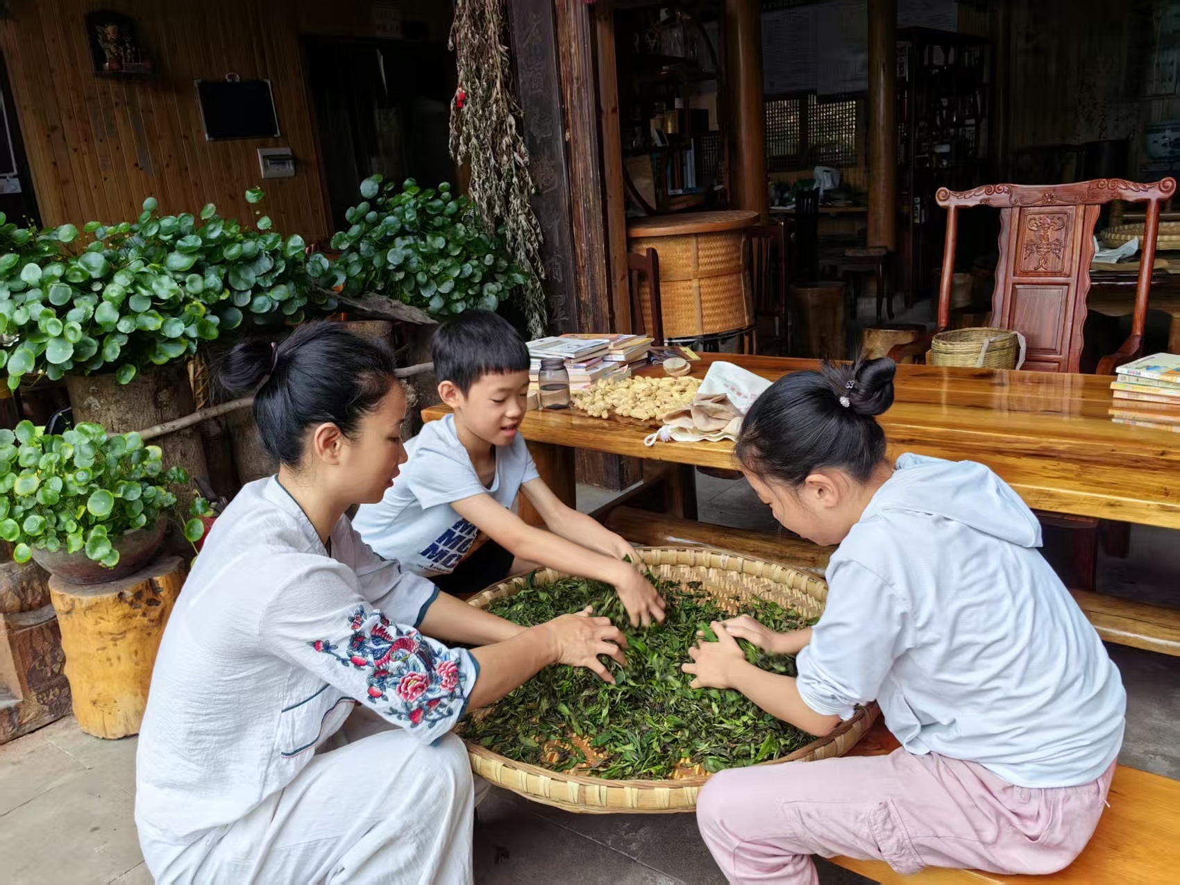 不仅爱制茶,她还担当着“推广大使”,把自家山庄变成了茶文化研学基地。在特色手工制茶房,几个十几岁的孩子正在体验制茶。“双手来回揉搓,温柔一点,用手掌感受铁锅的温度……”假期里,曾小丹教了一波又一波孩子怎么制作红茶。