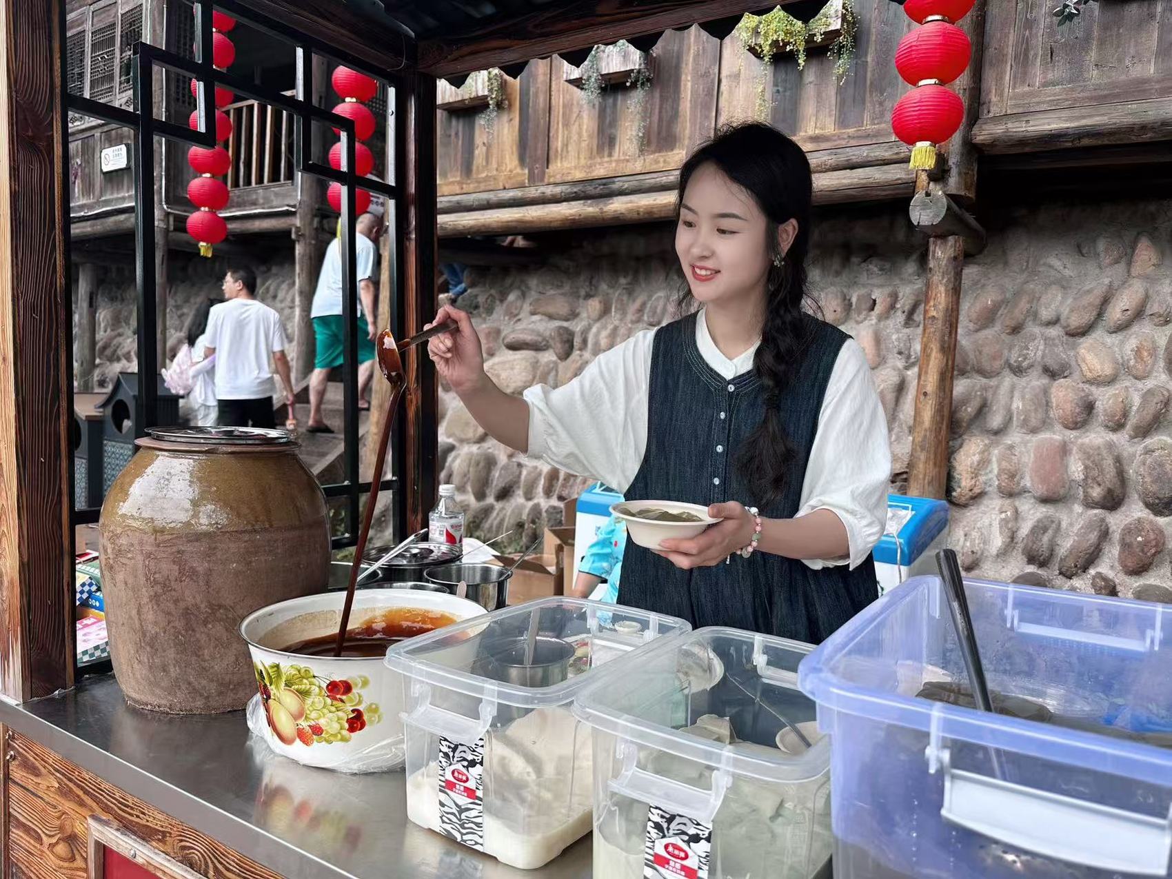 她售卖的茶冻、茶豆花、饺子和叶儿粑等,颇具洪雅特色。一口咬下去,唇齿间有股淡淡的茶香。这些是28岁的祁健伟开发的茶食。