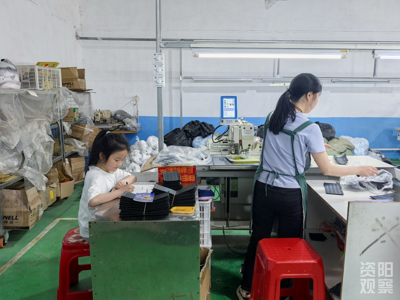 每到下午5点,工厂的车间内,扎着马尾的小女孩会在安全距离里,安静观摩母亲操控缝纫机的轨迹;小男孩则在车间角落划定的学习区伏案书写。等到休息时,孩子们才会上前抱抱妈妈。44岁的陈英与8岁女儿周彤洋之间便是这般默契——女儿在角落的专属学习桌写作业,抬头就能看见母亲忙碌的背影。