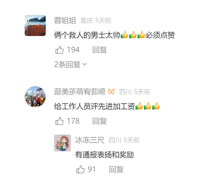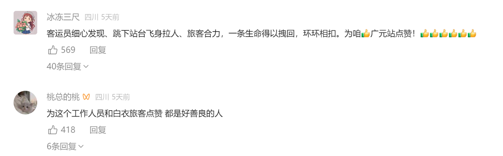 两人危难时刻挺身而出救人的事迹,赢得众多人的关注点赞,“两个救人的男士太帅了!”“向军人致敬!”“客运员细心发现、跳下站台飞身拉人、旅客合力,一条生命得以拽回,环环相扣。点赞!”