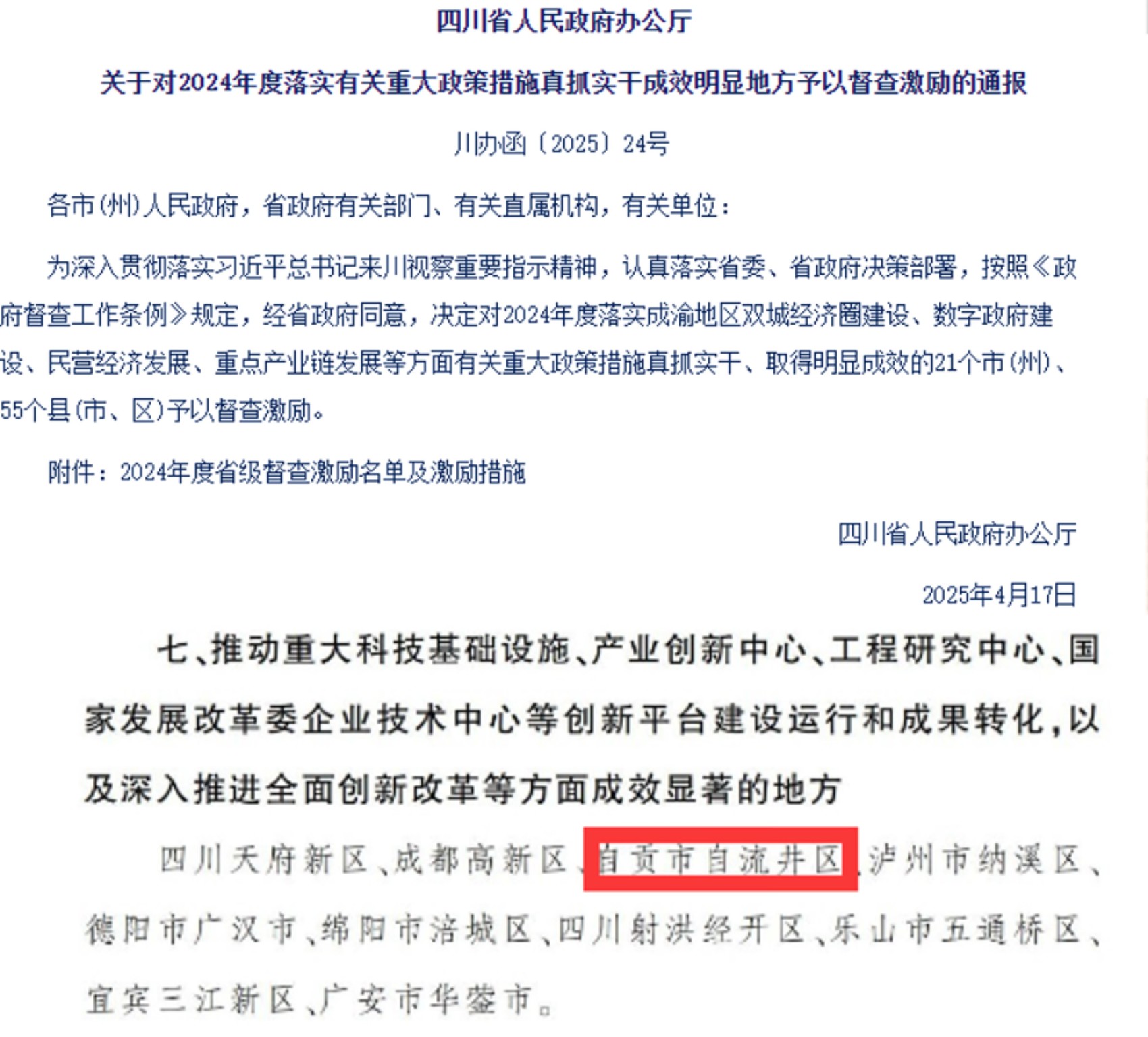 近日,四川省人民政府网站发布《四川省人民政府办公厅关于对2024年度落实有关重大政策措施真抓实干成效明显地方予以督查激励的通报》,自流井区作为全省10个、全市唯一区县进入省政府2024年度推动重大科技基础设施等创新平台建设运行和成果转化等方面成效显著督查激励地方名单。