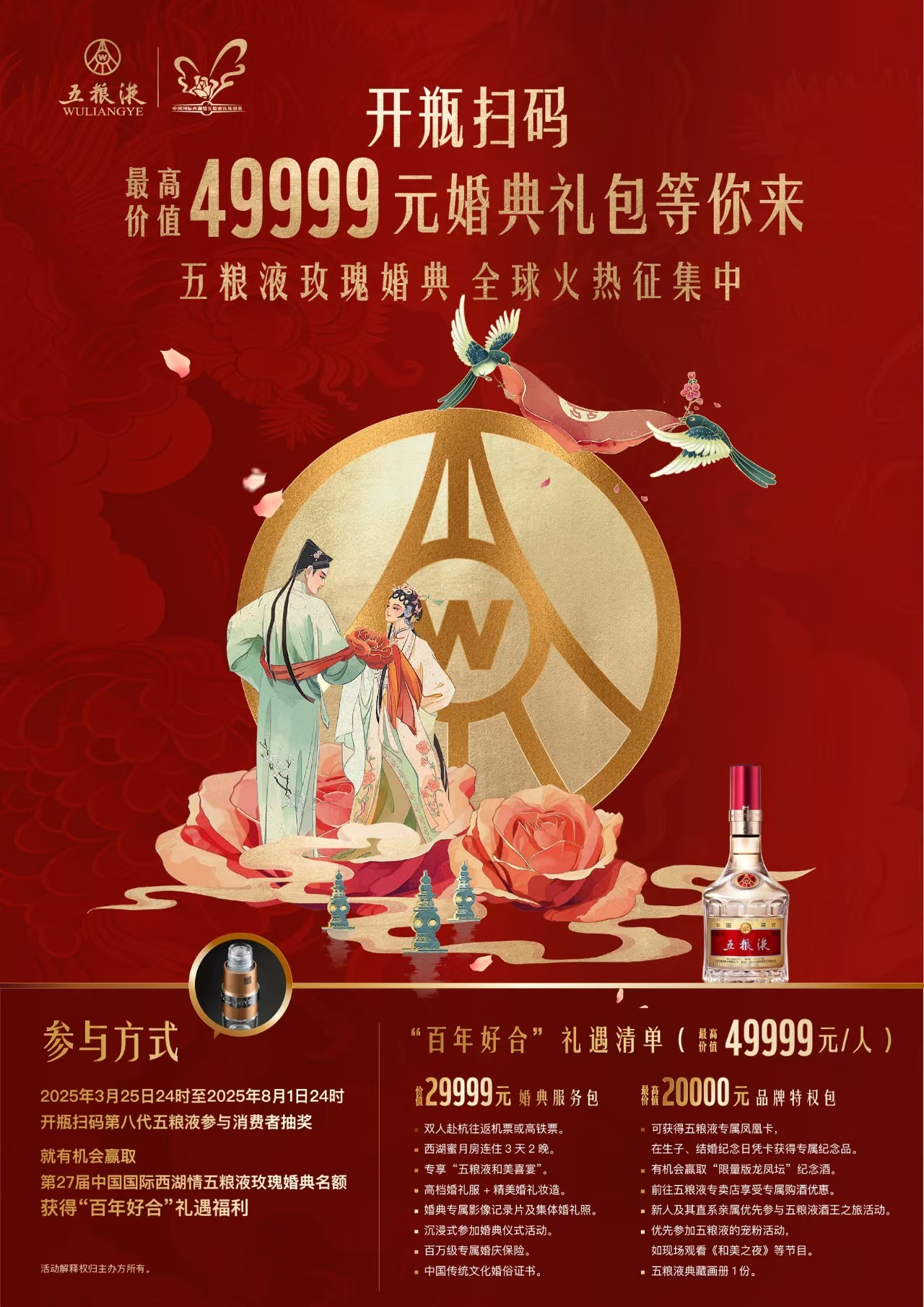 本届五粮液玫瑰婚典的“新婚贺礼”相当丰厚。消费者开瓶扫码第八代五粮液,就有机会赢取价值49999元的“百年好合”豪华礼遇,可以自己作为新人嘉宾,也可以转赠给新人朋友,参加第27届(2025)中国国际西湖情五粮液玫瑰婚典。目前,“第八代五粮液开瓶扫码抽取价值49999元五粮液玫瑰婚典名额福利”活动仍在继续,将于今年8月1日结束。