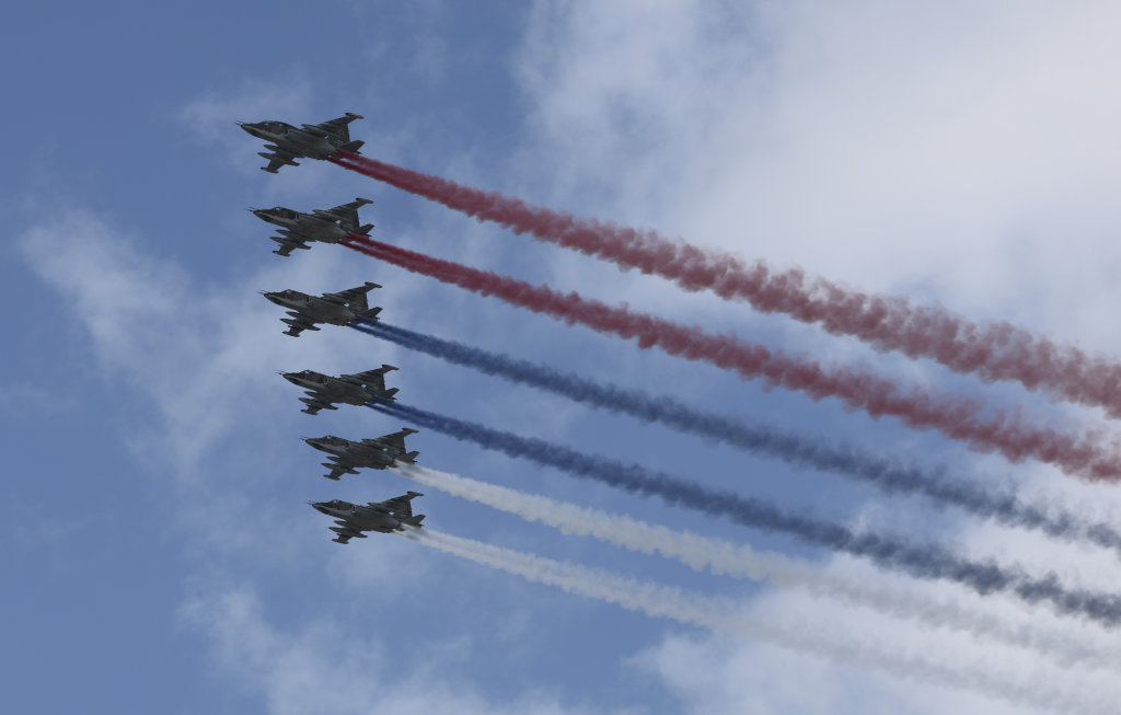 5月9日,在俄罗斯首都莫斯科,战机编队参加纪念苏联伟大卫国战争胜利80周年阅兵式。