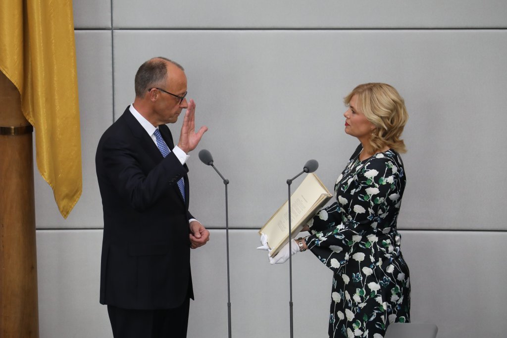 5月6日,在德国首都柏林的国会大厦,默茨(左)宣誓就职。图据新华社