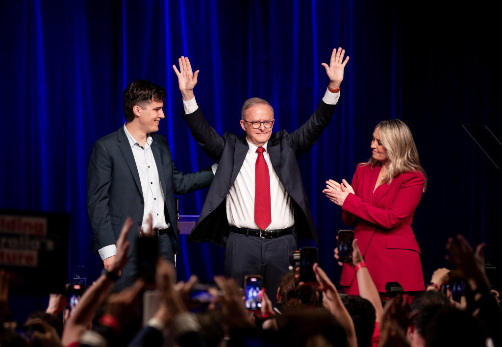 5月3日,在澳大利亚悉尼,澳大利亚总理阿尔巴尼斯(中)在竞选集会上庆祝胜利。图据新华社