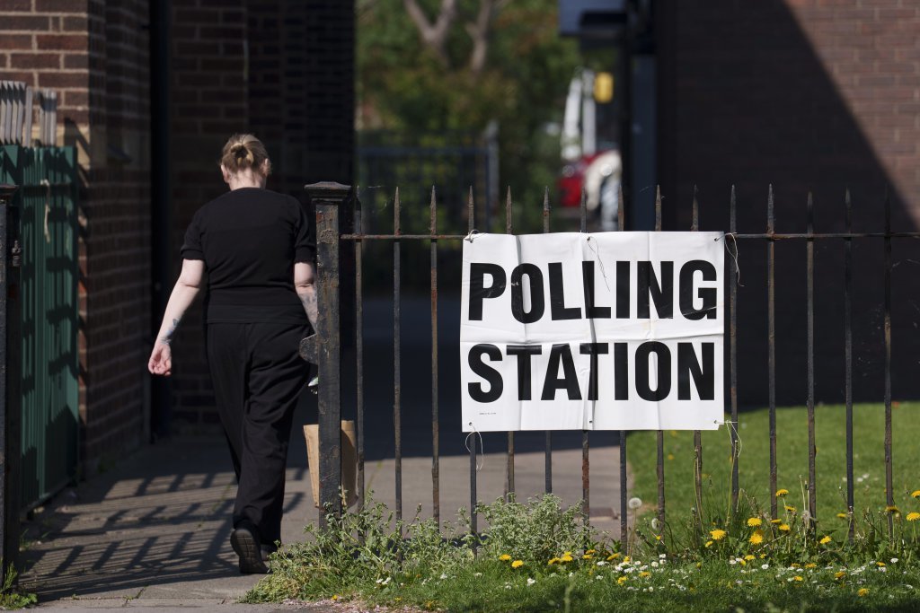 5月1日,在英国普雷斯顿,一名女子走向一家投票站。英国5月1日上午举行英格兰部分地区的地方选举。图据新华社