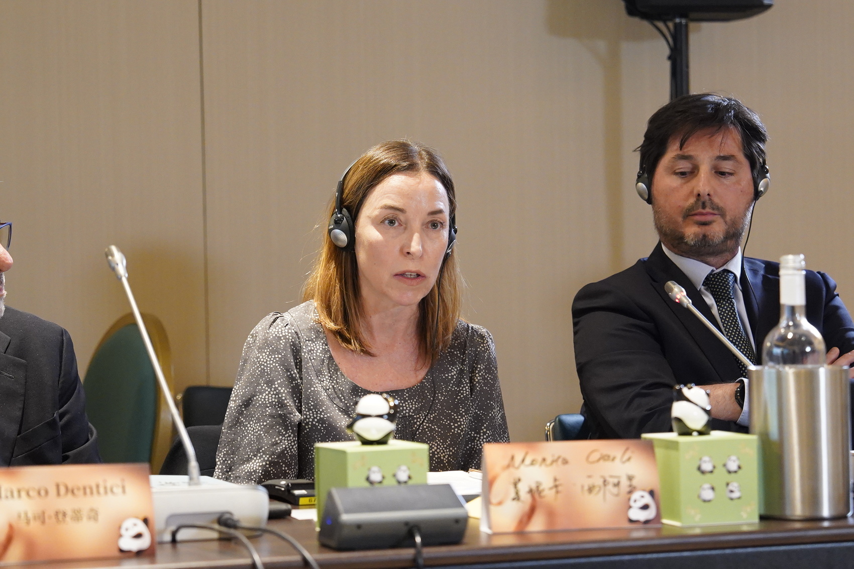 北京时间5月9日晚间,“金熊猫奖·意大利之约”交流会在意大利首都罗马举行。意大利密涅瓦影业国际部总监莫妮卡·西阿里在交流会上发言。