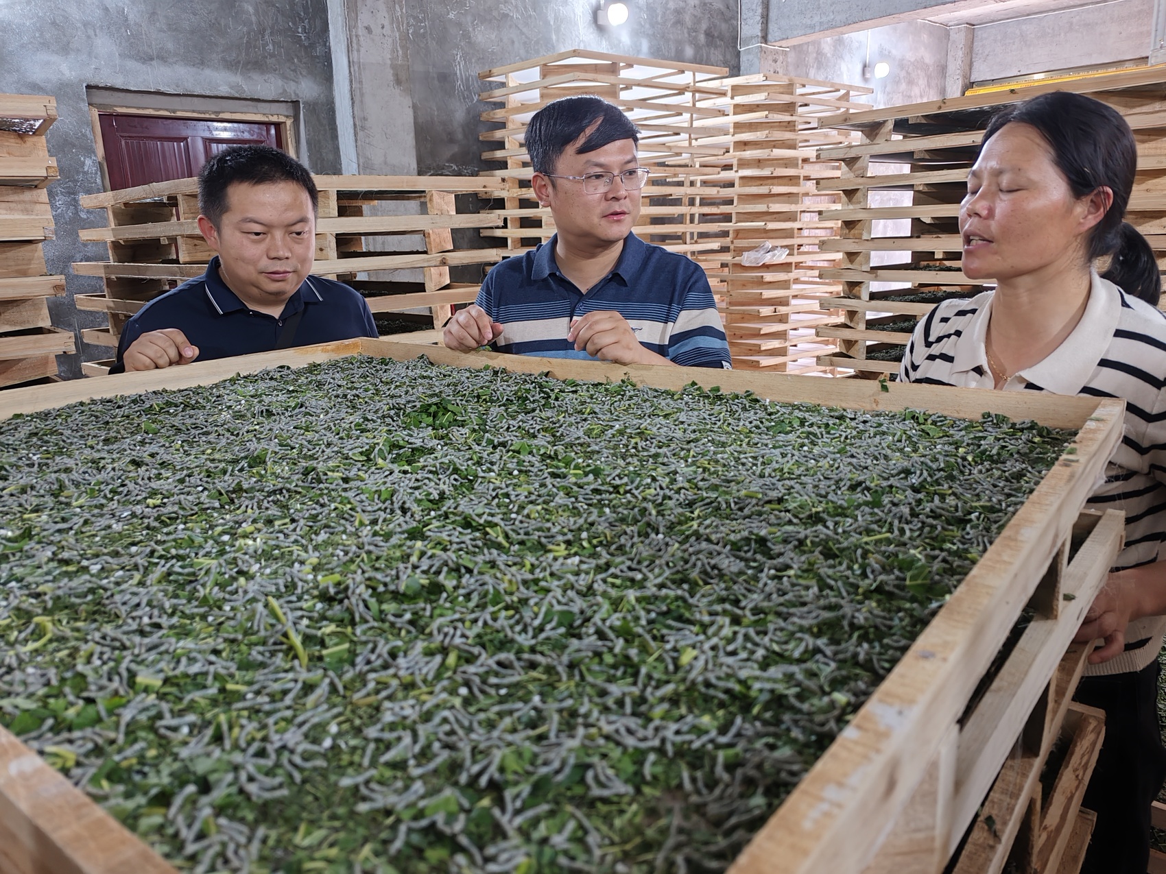 “我们在5月7日发了一批(16张种)1-2龄人工饲料小蚕到珙县共育户中。共育户通过桑叶共育1个龄期至4龄,再发放到农户,农户用桑叶饲养10天就可以结茧。”宜宾市农业科学院高级农艺师李冬兵说,“从2020年开始,我们就在珙县、高县分别选择10余户养殖户示范人工饲料养蚕技术,还引进了国内的多个人工饲料蚕品种。2024年创新推出1-2龄人工饲料共育,3龄桑叶共育的‘十日养蚕法’,可有效提高饲料蚕整齐度和产量。同时,我们也联合四川省三台蚕种场、宜宾市蚕桑产业发展中心、四川省农业科学院蚕业研究所制定了四川省人工饲料养蚕主推技术和宜宾市小蚕人工饲料共育地方标准,并选育出了适应稚蚕人工饲料育的新蚕品种‘宜乐1号’,今年3月通过了审定。”