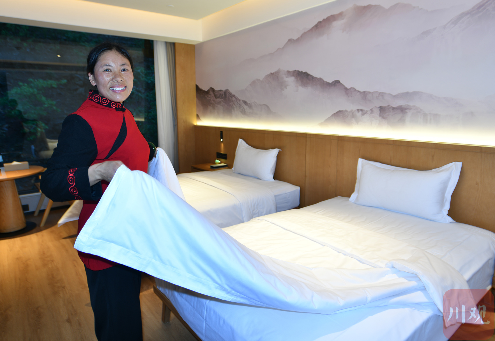 这是在昭觉县悬崖村酒店,客房人员阿勒长英整理房间、更换床单被套的一幕。看着丝滑的操作,很难想象,曾经是悬崖村村民的她,现在已能在酒店应对自如。