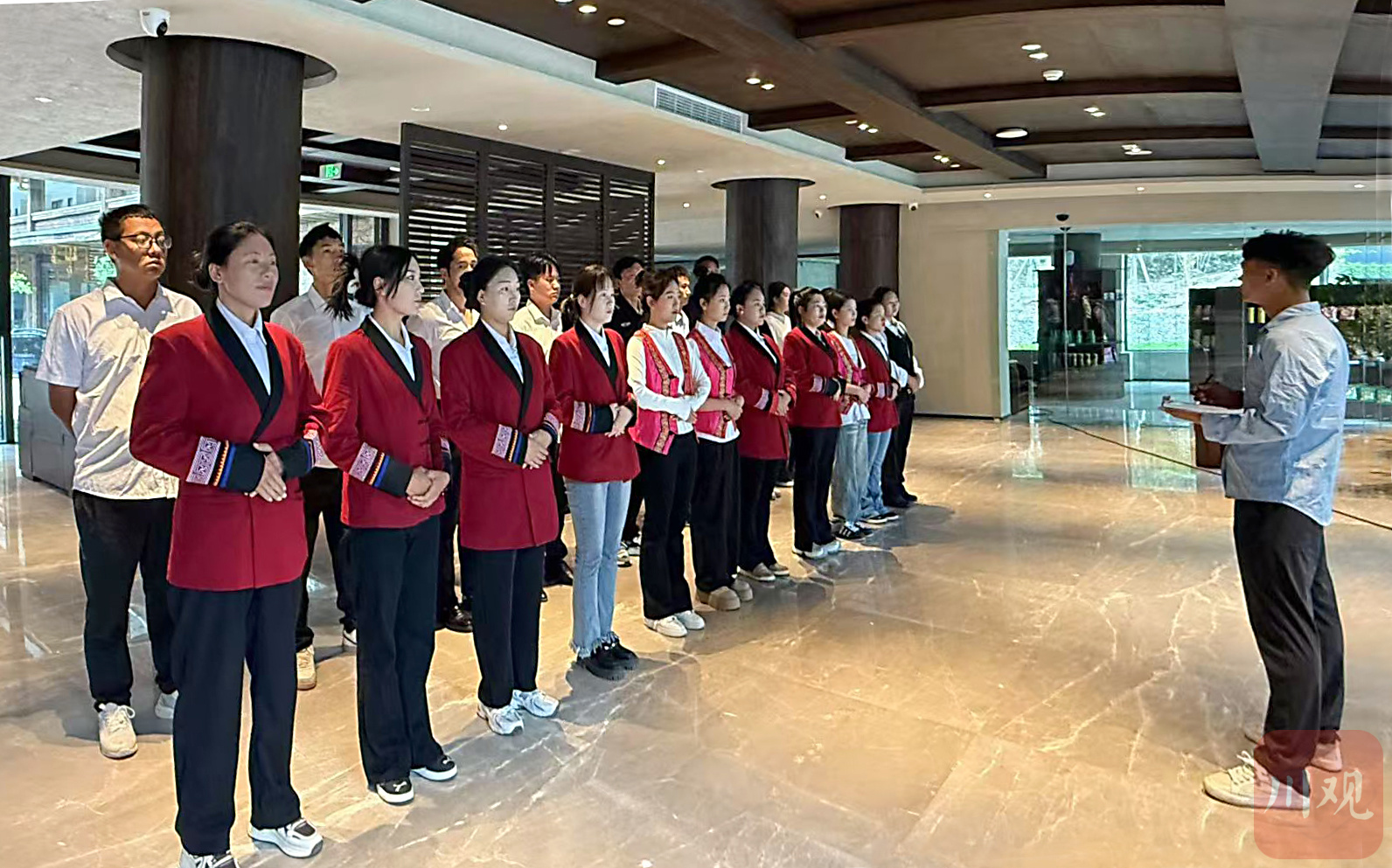 2025年5月2日清晨,悬崖村天空之谷项目酒店组织员工开班前会,图左前排一为阿勒长英。