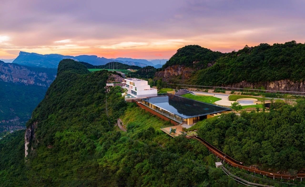郎酒庄园·敬天台曾屡获国际建筑大奖,它是一处覆土式地下建筑,隐于山间绝壁,2500平方米镜面水池屋顶连天接水,整体宛若悬浮在山谷间的“天空之镜”。