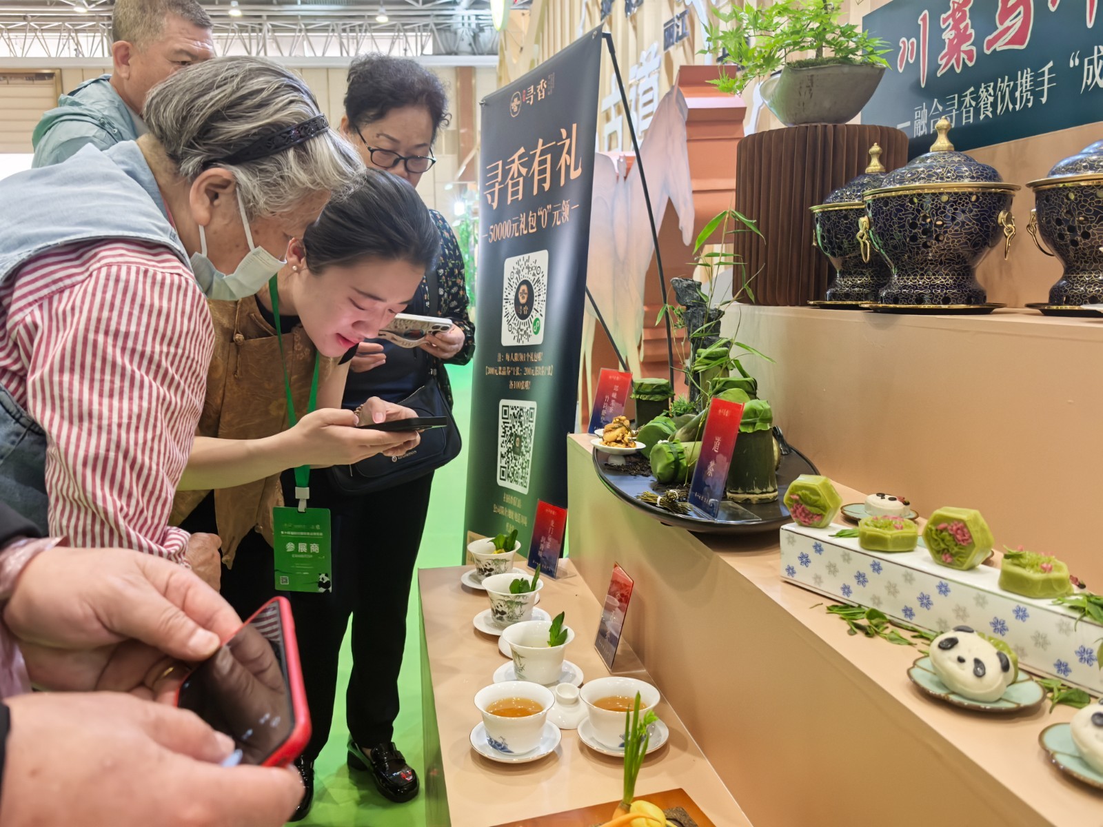 邛崃黑茶煨制的山珍鲜香扑鼻,古枇杷茶煎出的牛肉风味独特……每当观众驻足展台,好奇地打量这些别具一格的餐点时,融合寻香餐饮的工作人员都会耐心细致地讲解这些“茶餐”的特色。