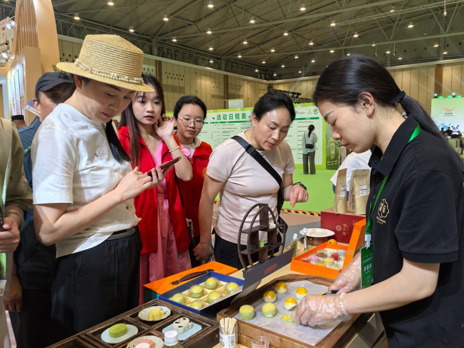 推介会后,超微茶浆点心展台前围满了观众。大家纷纷研究起摆放的超微茶浆样品,品尝茶浆蛋黄酥、面包、水晶粽等点心,不少茶相关行业从业者主动加工作人员联系方式、询问合作事宜。