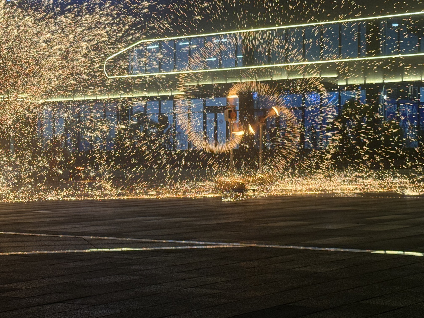 “要打铁花了!”不知谁一声高呼,现场瞬间沸腾。只见匠人奋力挥起木勺,滚烫的铁水如流星般砸向夜空,刹那间绽放成千万朵银花,金色的“瀑布”倾泻而下,映亮了所有人的脸庞。此起彼伏的快门声与尖叫声交织,有人激动地跳起来,有人捂住嘴巴满脸震撼。