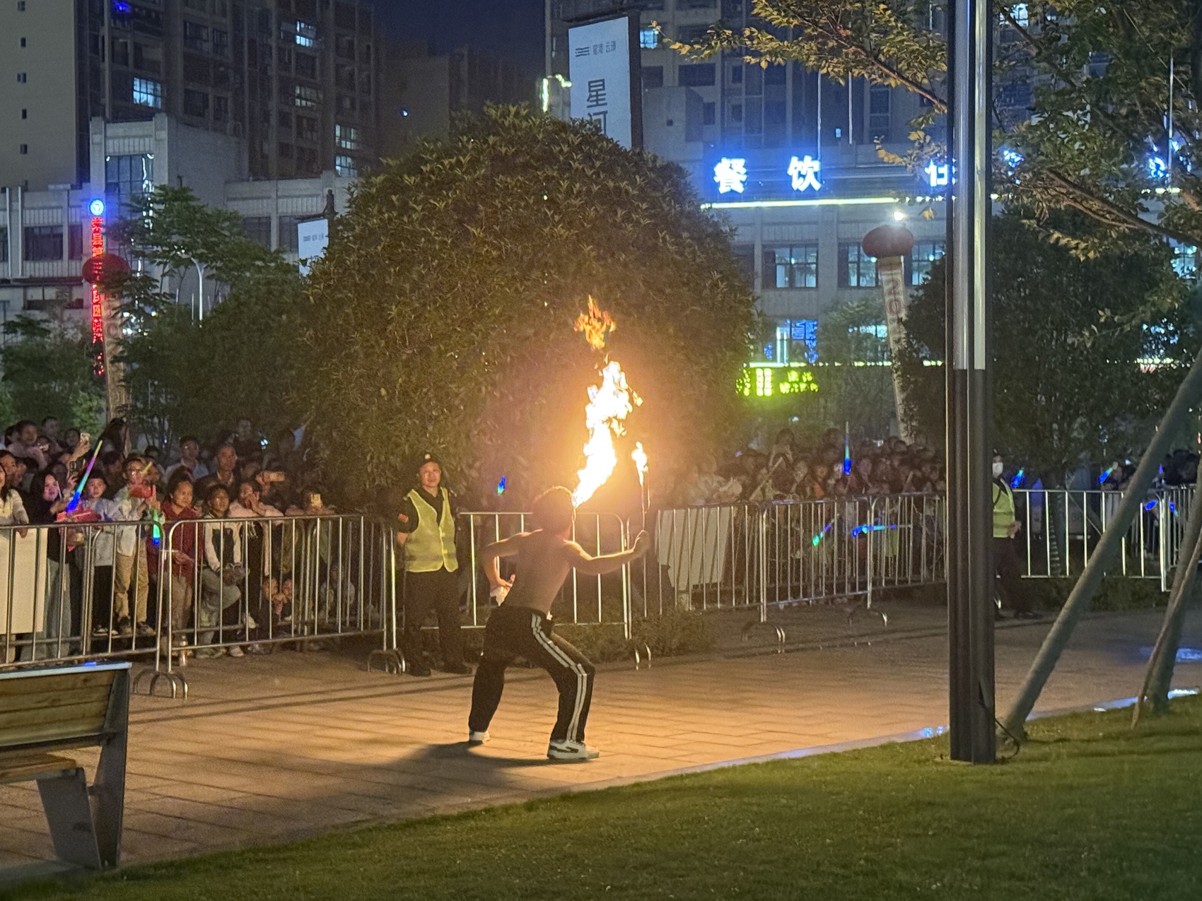 当天下午,活动现场人头攒动、热闹非凡。非遗表演区围满观众,川剧变脸、杂技表演等非遗节目精彩上演,表演者精湛的技艺赢得了阵阵掌声,让人意犹未尽。据了解,活动期间还有火壶秀、火舞秀、篝火狂欢、流星雨瀑布、国潮花灯等非遗演绎。