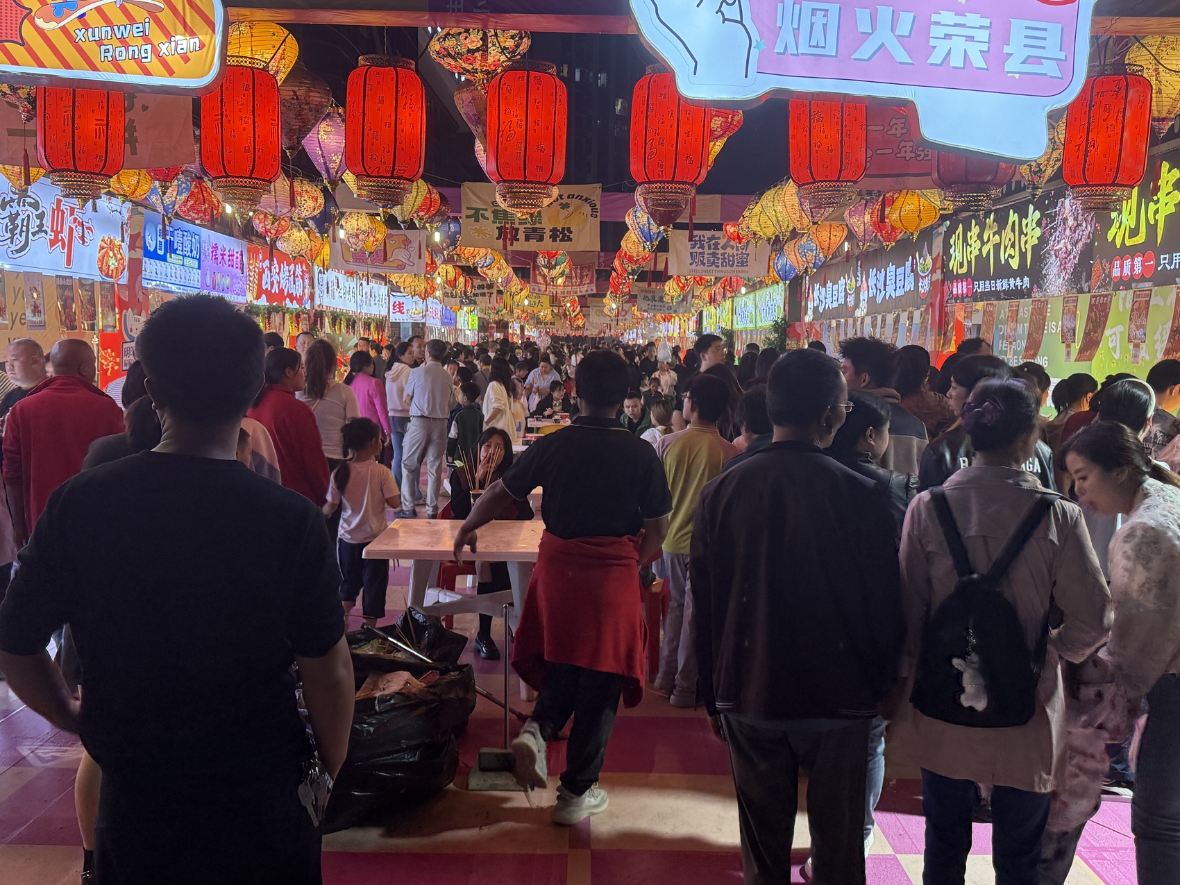 另一边的花灯市集灯火璀璨,四大特色区人气爆棚。四川美食区飘着钵钵鸡的藤椒香,特色小吃芒士牛排滋滋冒油……现场此起彼伏的吆喝声、欢笑声,勾勒出热闹非凡的市井画卷。