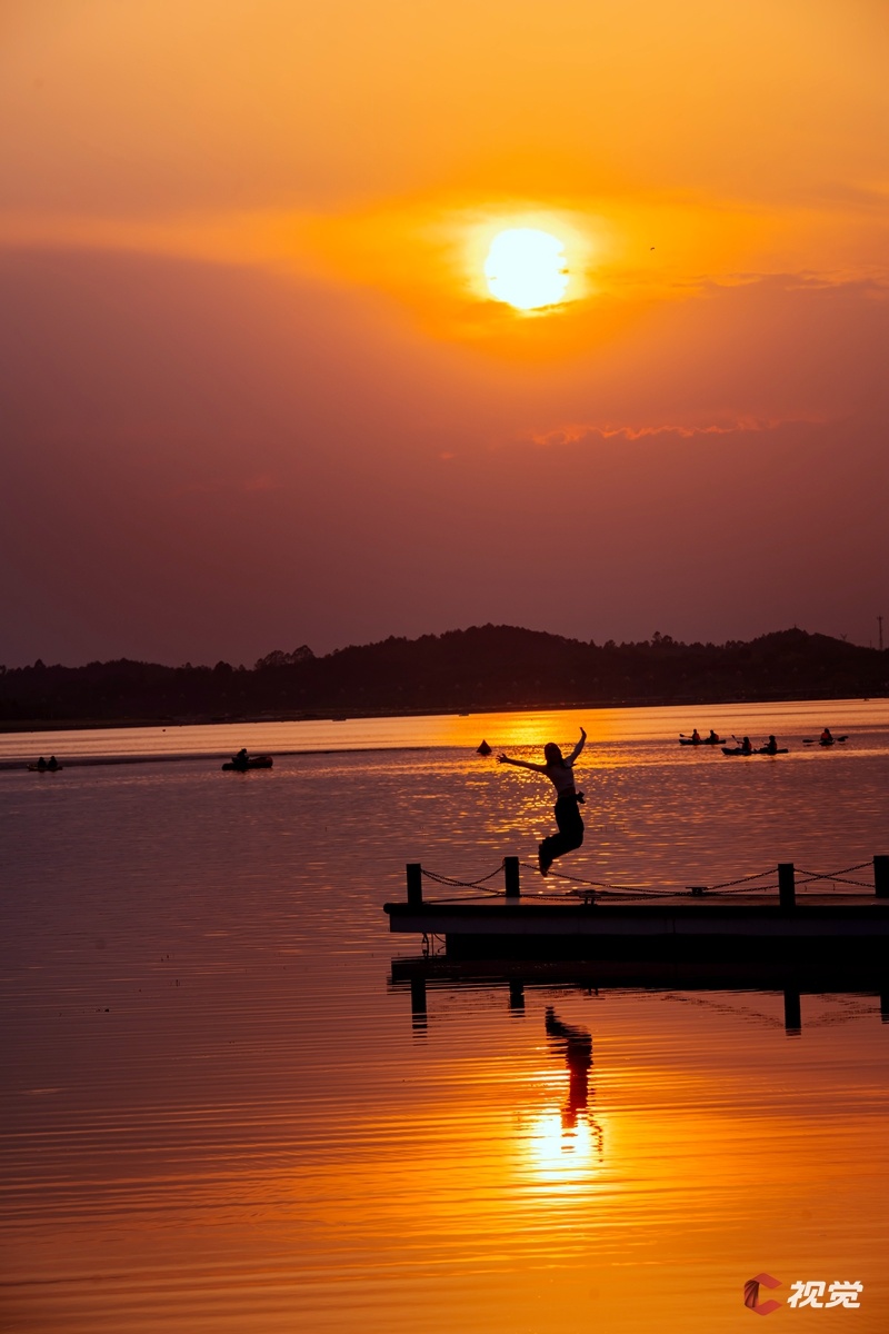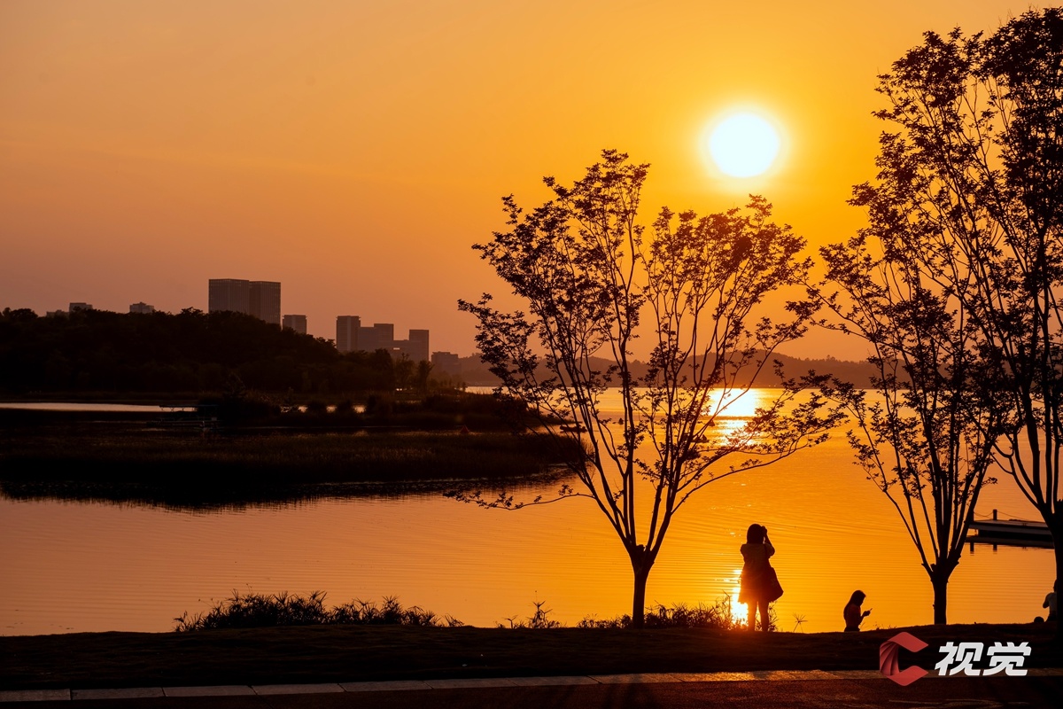 5月12日,夕阳将兴隆湖映照成梦幻的橙色,游人在湖畔打卡拍照。