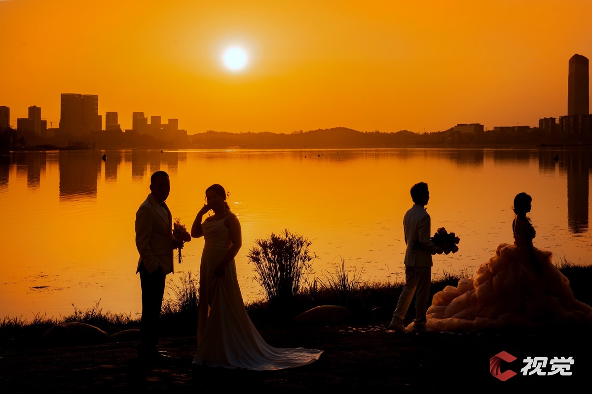 5月12日,夕阳将兴隆湖映照成梦幻的橙色,不少新人在湖畔拍摄婚纱照。