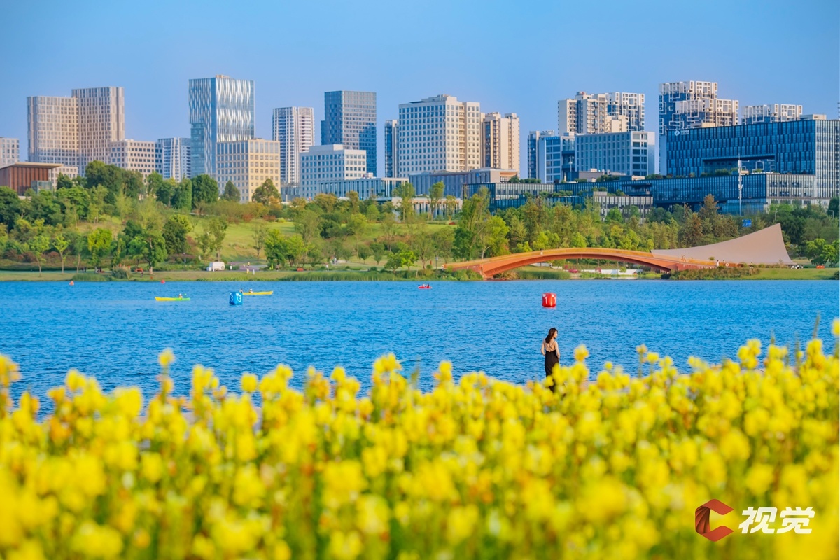 5月12日,成都兴隆湖畔鲜花盛开,吸引不少市民前来拍照打卡,定格美景。