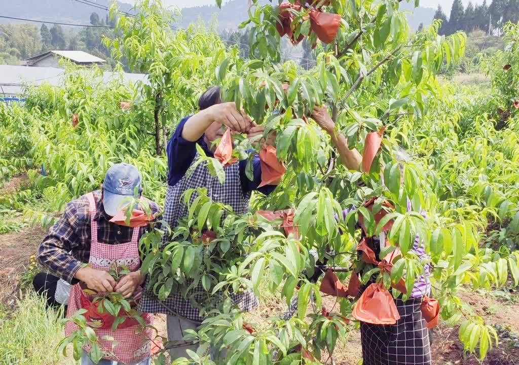 “今年六月上旬,油桃与蟠桃将迎来丰收,此刻正是套袋的黄金时机。”梁小平介绍道,“套袋就像给果实穿上了一层防护服,能有效抵御虫鸟的侵扰,减少病虫害的发生,还能防止果实开裂与果锈的产生,让果实色泽更加艳丽、品质更加上乘,延长市场供应的周期。”