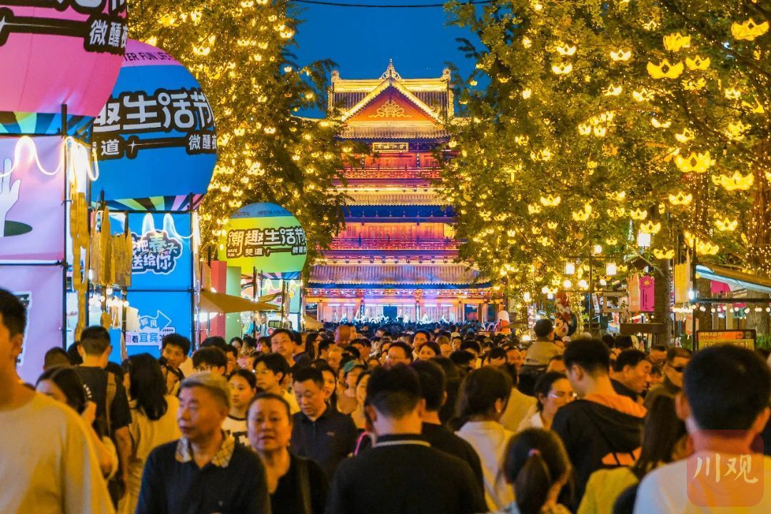 穿梭在僰道历史文化旅游休闲街区,文旅新场景与传统建筑相得益彰。游客排起长队打卡互动游戏,街区满是特色美食、国潮非遗特色业态,彰显地方传统文化特色,让游客直呼“巴适”。