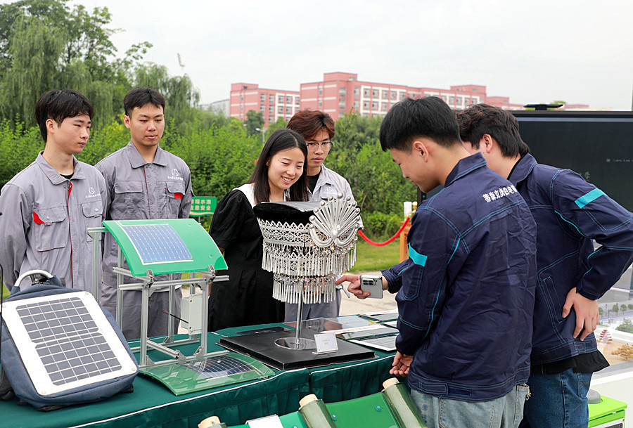 乐山,正在建设中国绿色硅谷。乐山职业技术学院为晶硅光伏千亿产业集群输送了许多职业工人。在光伏太阳能展台上,一顶彝家女子头戴的“彝冠”,是可穿戴式的光伏产品。乐山职院能源学院教师余佳丽介绍,光伏彝冠在阳光下自动“充电”后,可以发光五六个小时,目前正在与厂商洽谈合作。除此之外,学院还展示了新研发的光伏琉璃瓦、彝家特色光伏路灯等,很快将推向市场。