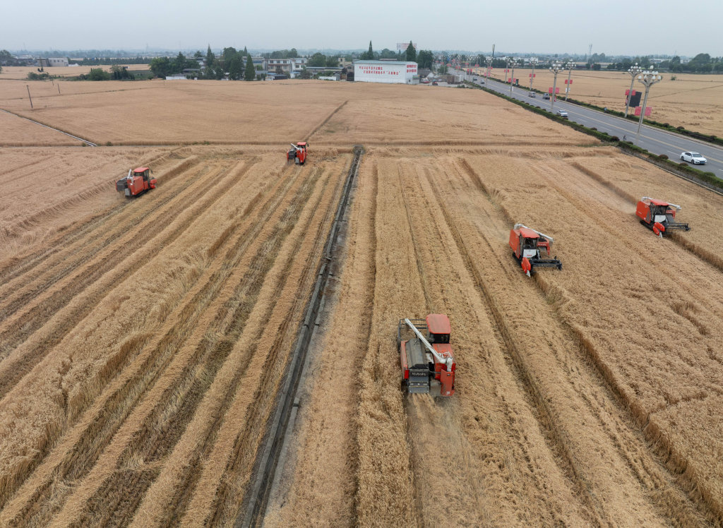 5月15日,收割机在广汉市连山镇万亩小麦高产示范片收割小麦(无人机照片)。