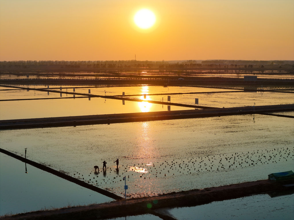 在黑龙江省佳木斯市富锦市的万亩水稻公园,一块块稻田宛若“天空之镜”,劳动者在“镜”中插秧作业,与蓝天白云、夕阳霞光构成壮美的农耕图景。