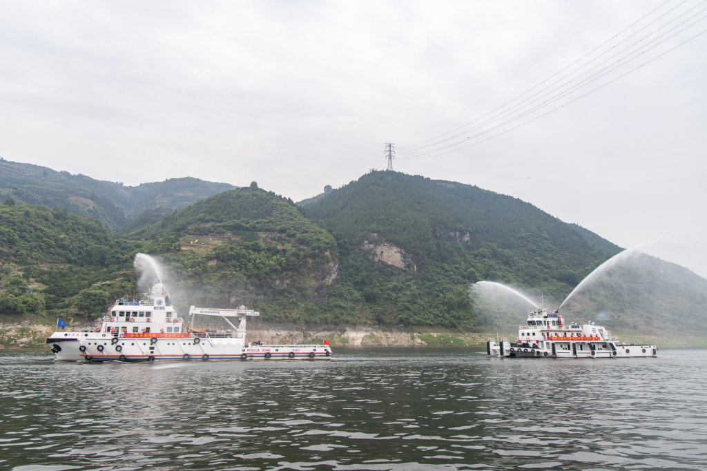 5月15日,重庆市交通运输委联合奉节县人民政府,组织多部门开展三峡库区地方航道危岩地灾应急演练。演练模拟奉节县朱衣河硝水坪危岩地灾点因持续强降雨突发大面积滑坡,塌方体倾泻入河,导致搭载300余名乘客的“赤甲1号”客船失控,人员落水;朱衣河码头陆路通道阻断,100余人、10余台车辆被困;下游货船断链失控等多灾并发的复杂场景,全面检验人员救助、旅客转运、船舶拦截拖带、港口避险、航道扫测与疏浚等水上应急救援能力,为长江航运安全保驾护航。