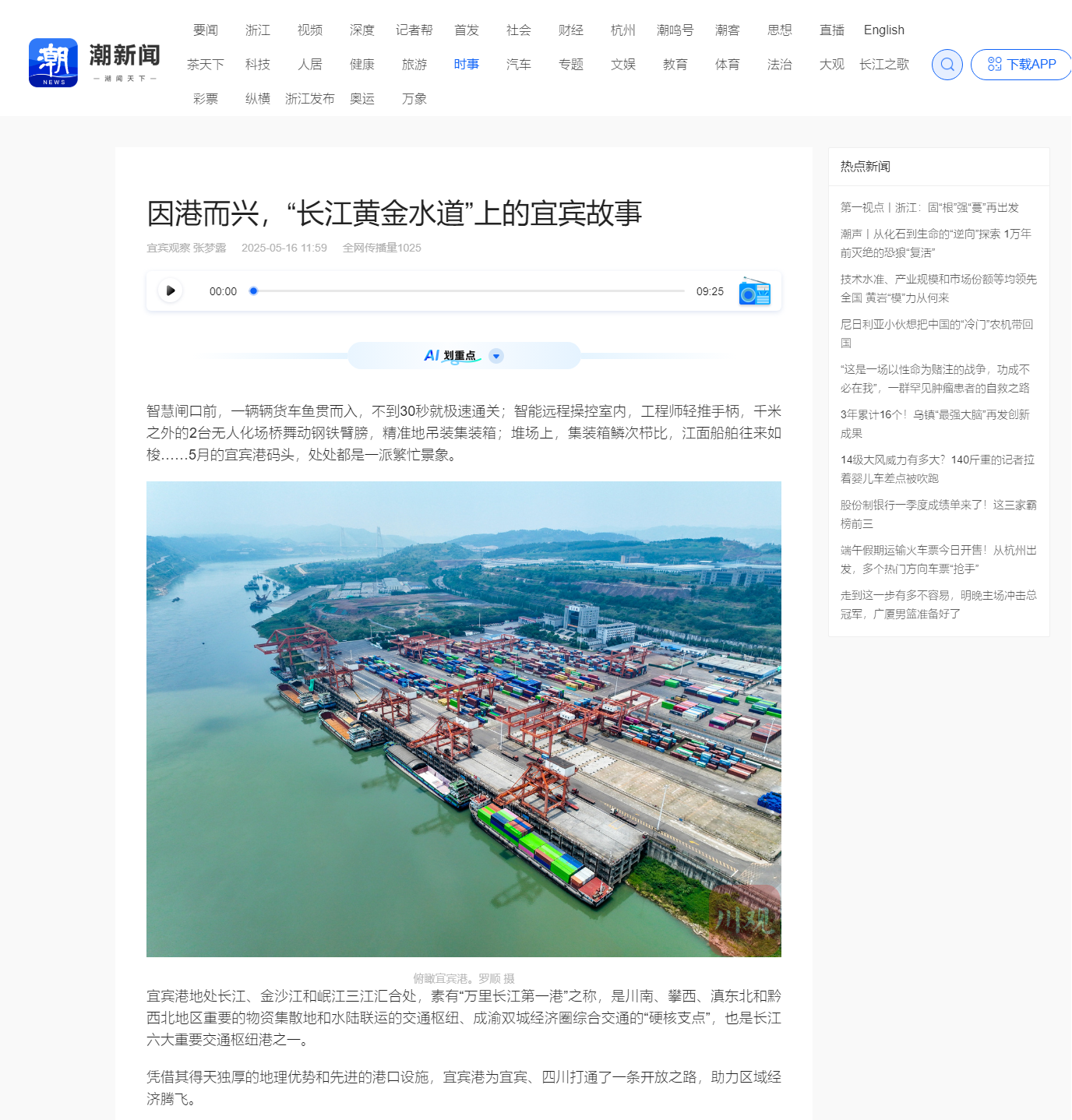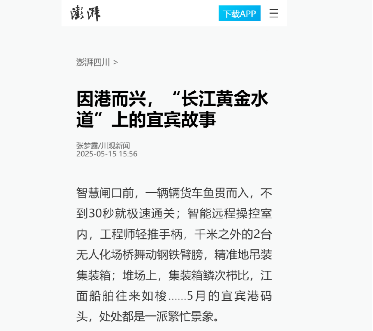主要报道了宜宾港凭借地理优势和智慧港口建设,实现物流效率大幅提升,推动区域经济发展的成果。同时,通过航线拓展和多式联运体系完善,宜宾港促进了产业集聚和对外开放,助力四川打造内陆开放新高地。