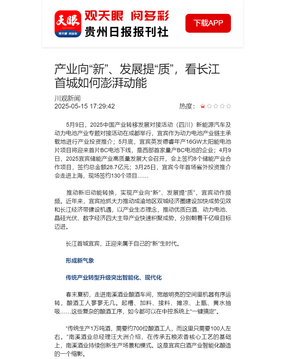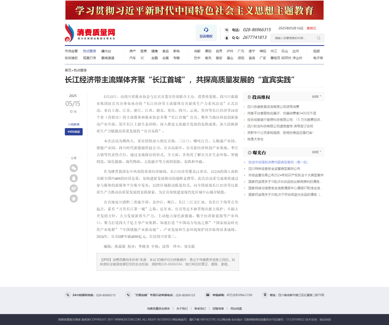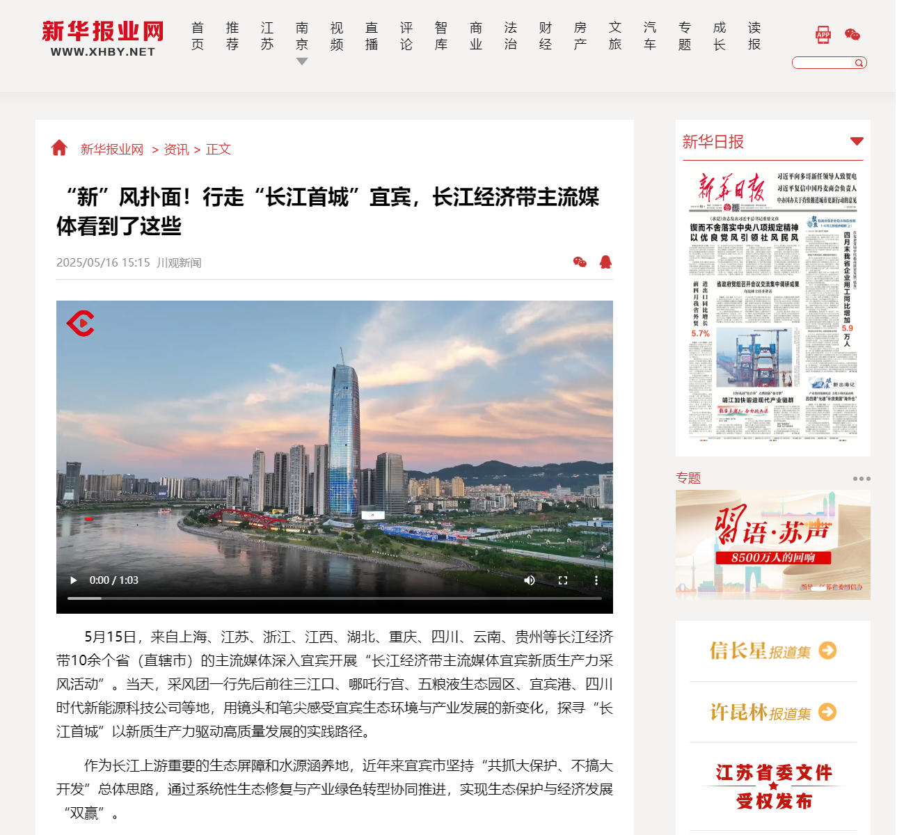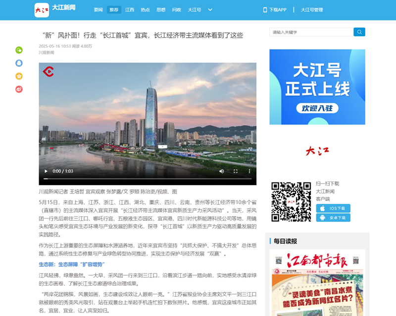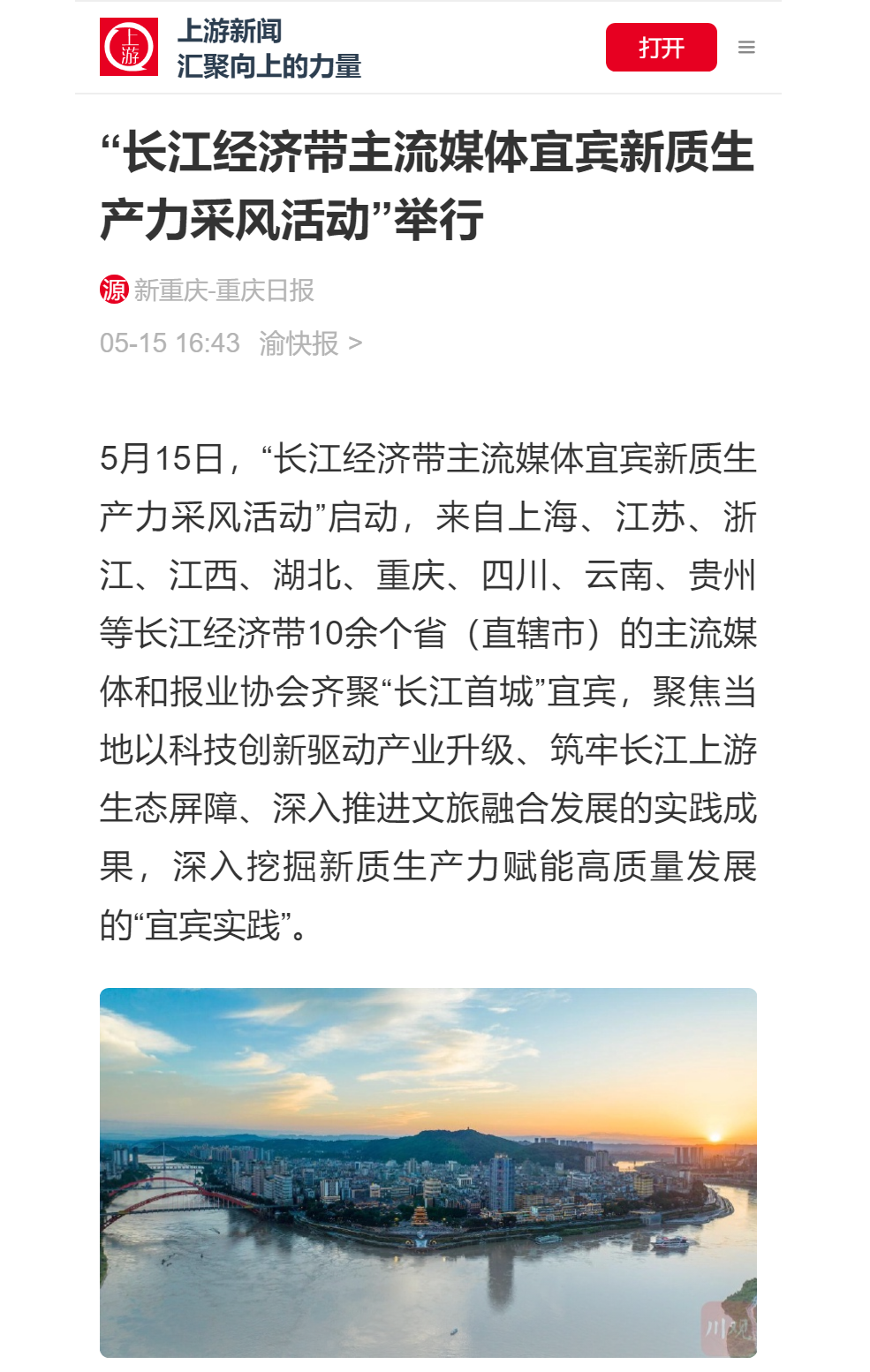 5月15日至16日,由四川省报业协会与宜宾市委宣传部联合主办,消费质量报、四川日报报业集团驻宜宾办事处承办的“长江经济带主流媒体宜宾新质生产力采风活动”在“长江首城”宜宾开展,来自上海、江苏、浙江、江西、湖北、重庆、四川、云南、贵州等长江经济带10余个省(直辖市)的主流媒体,聚焦宜宾在生态环保、智能制造、绿色能源、现代物流、文旅融合等领域的创新和突破,共探高质量发展的“宜宾实践”。