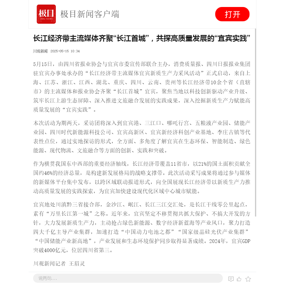点击阅读:长江经济带主流媒体齐聚“长江首城”,共探高质量发展的“宜宾实践”