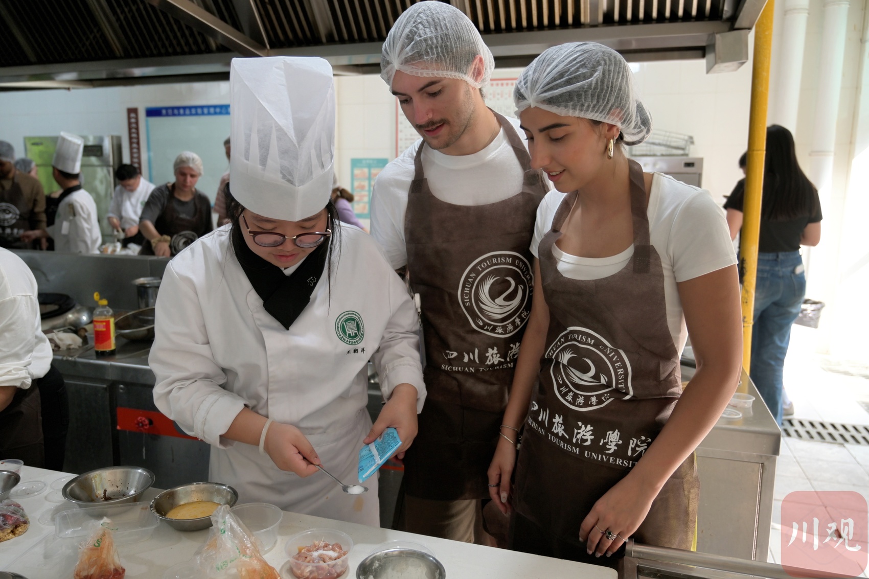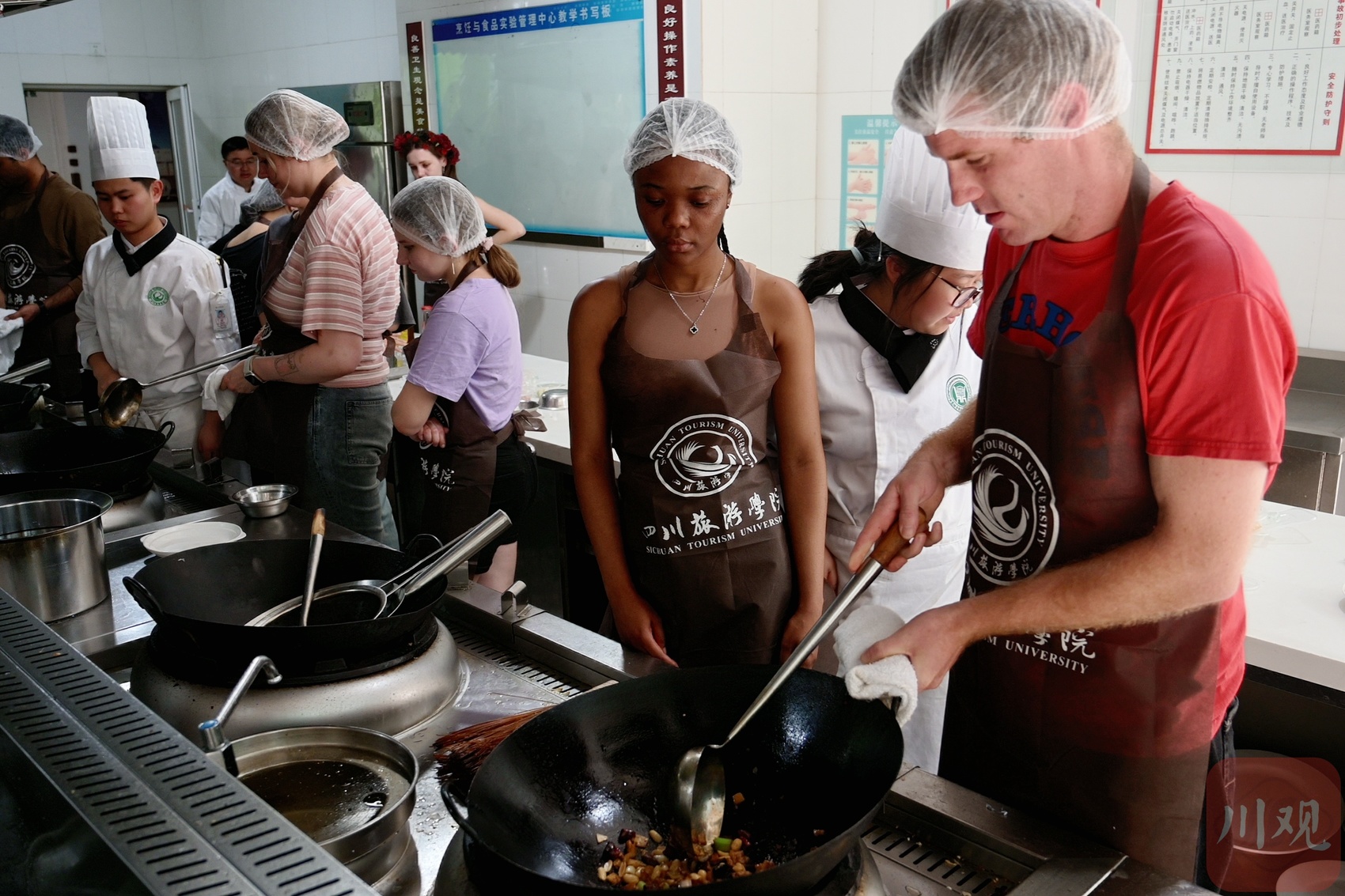“很麻,我喜欢这个感觉。”来自英国的留学生爱乐,回味着麻婆豆腐的味道。5月15日,“川菜飘香,美食互鉴:留学生川菜文化体验沙龙”在四川旅游学院举行,四川大学海外教育学院的29名留学生走进川菜文化体验沙龙,在川味的盛宴中体验川菜的麻辣鲜香。同学们的任务是掌握经典川菜“宫保鸡丁”和“麻婆豆腐”的烹饪方法和技巧。