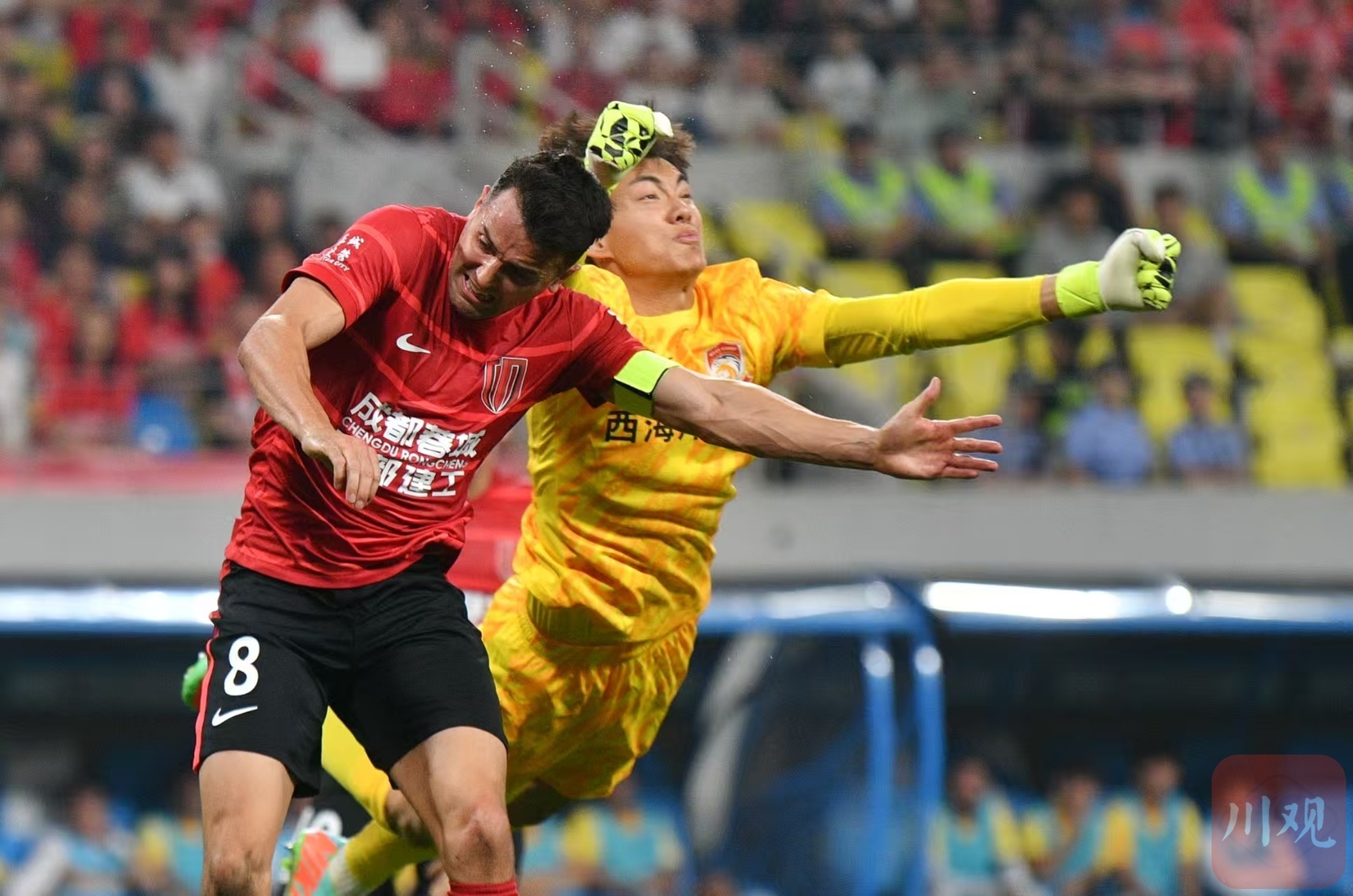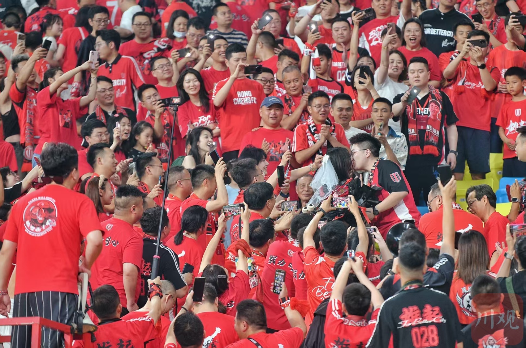 有趣的是,当天比赛场下热闹非凡。比赛开始之前,成都蓉城俱乐部为国门刘殿座举行了职业生涯300场中国顶级联赛出场纪念仪式。中场休息的时候,现场转播摄影机则将视角对准看台球迷并快速移动,依次锁定10名球迷,锁定的球迷可自行摆出造型进行回应。比赛结束之后,前信乐团主唱、歌手苏见信与现场4万多名球迷一起高唱《海阔天空》,让现场氛围达到高潮,也为这场足球盛宴增添更多激情与活力。