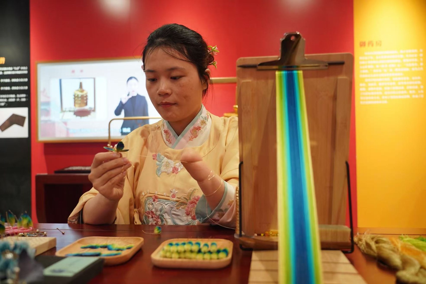 在主展区,来自成都市青白江区十二针绣坊的《千里江山图》系列文创绣品、成都市龙泉驿区的双面蜀绣熊猫摆件《墨白衔朱》、阿坝州若尔盖县的金属雕刻艺术摆件《故宫》、雅安市宝兴县的穆坪贡砚《熊猫文创系列》、眉山市青神县的竹编摆件《国宝小台屏》等100余件残疾人非遗文创精品精彩亮相,凝聚了四川15个市(州)52名非遗工匠、创客的智慧力量,涵盖蜀绣、竹编、雕刻、剪纸等多元非遗门类。